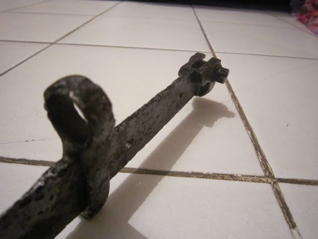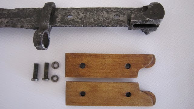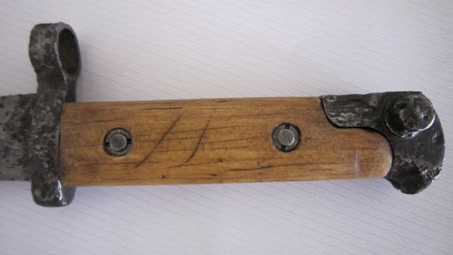 Все таки решил немного отреставрировать, как сумею: еще чуток почистил от ржи стальной щеточкой на Dremel'е. Сделал накладки из бука. Оказалось не так просто, потому что не нашел чертежа, да к тому же на внутренней стороне есть небольшая "ступенька". В общем засунул сам штык в копировальную машину и работал по этой копии. После понасажал царапин. Старил дерево марганцовкой (откопал в нете рецепт, если кому надо, скину ссылку), и пропитывал/затемнял смесью льнянки с пчелиным воском и трепентином. Винты/гайки переделывал из того, что было, старил сначала хлорным железом(Спасибо Диме аkа Pesel), а потом сановским антикальком, в нем 15% ортофосфорки. В конце покрыл штык и накладки ренесансом.