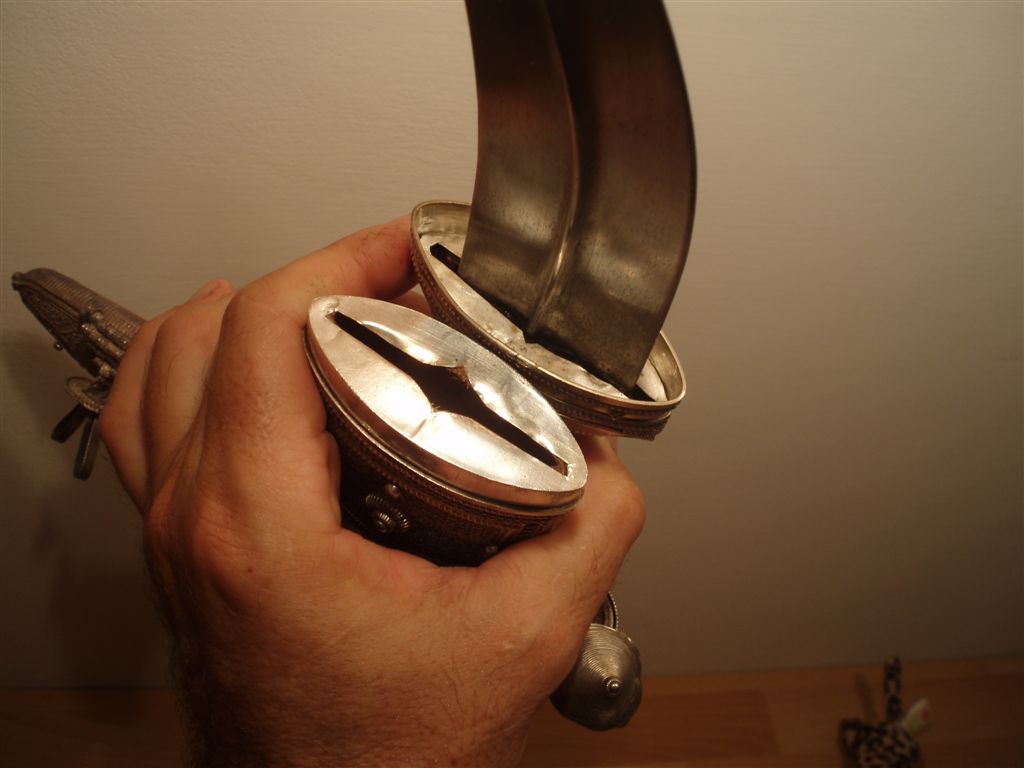 Я кавказкие кинжалы не собираю , но у меня есть столетняя джамбия с такой же " пустотой вокруг клинка " как на твоем "кавказце" .Способ сочленения тебе будет понятен из моих фоток . Успехов !