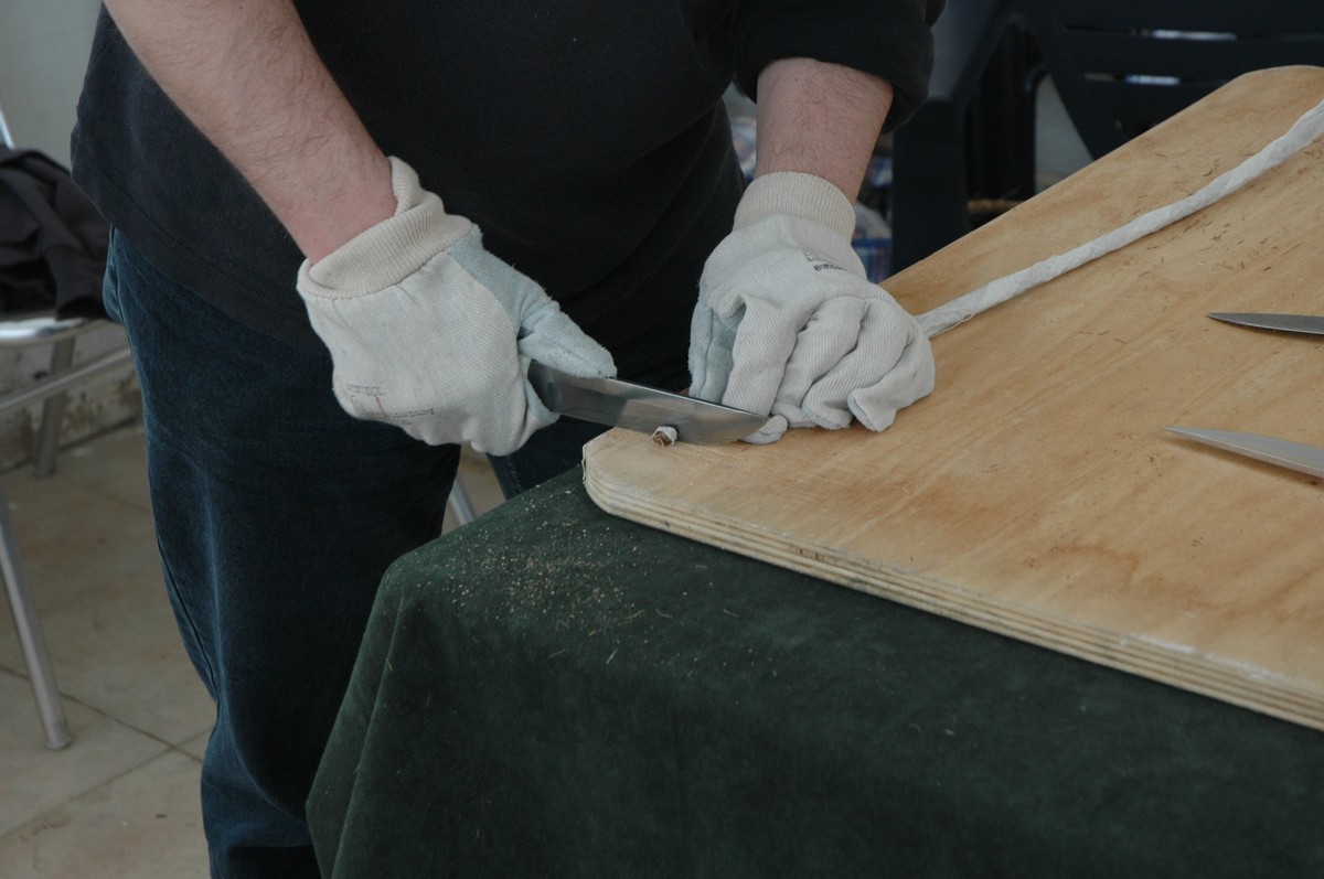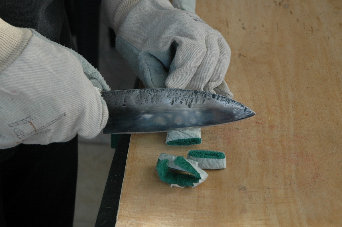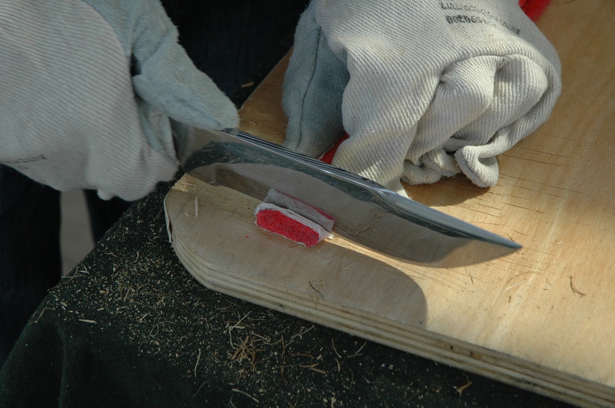 Тут вроде бы наметилось некое улучшение, несмотря на такой непростой материал для теста. По крайней мере, первые пару резов нож сделал четко и без излишнего напряга. Потом окончательно стал сопротивляться при резе, норовя выскочить из руки. Поменяли угол реза, но, увы, нож тут же сел окончательно, перестав даже надрезать. Пришлось остановить тесты, смирившись с положением…