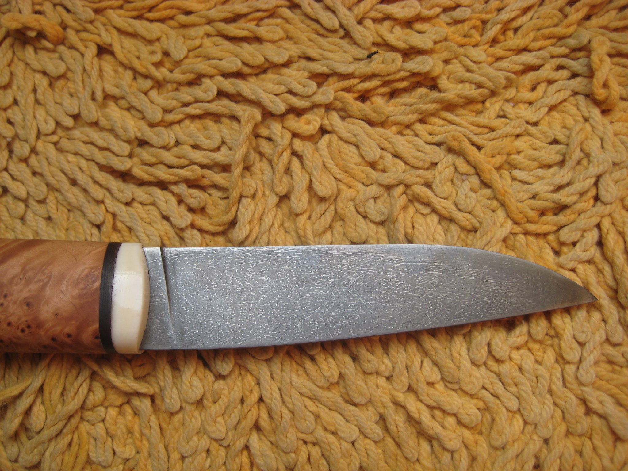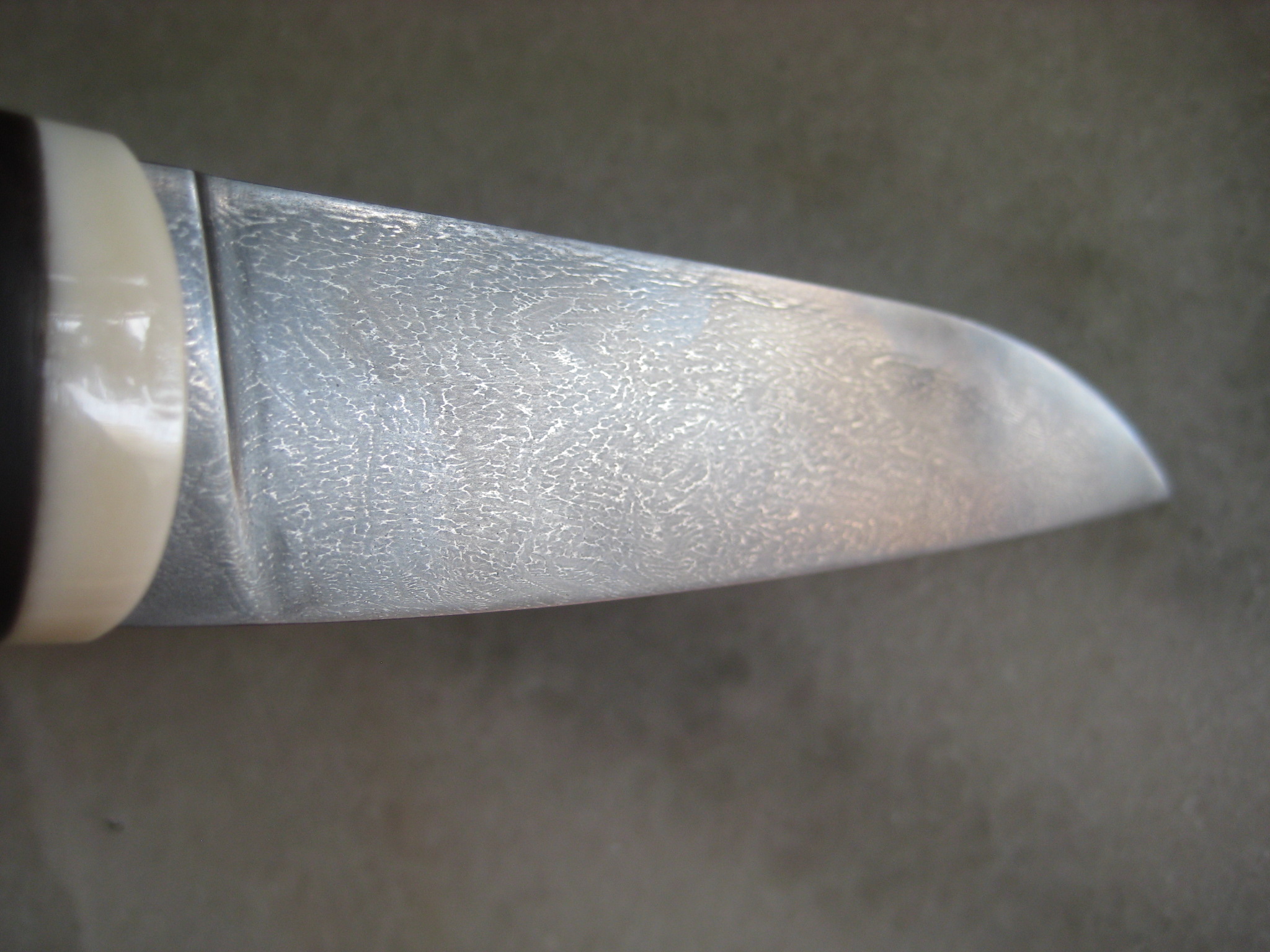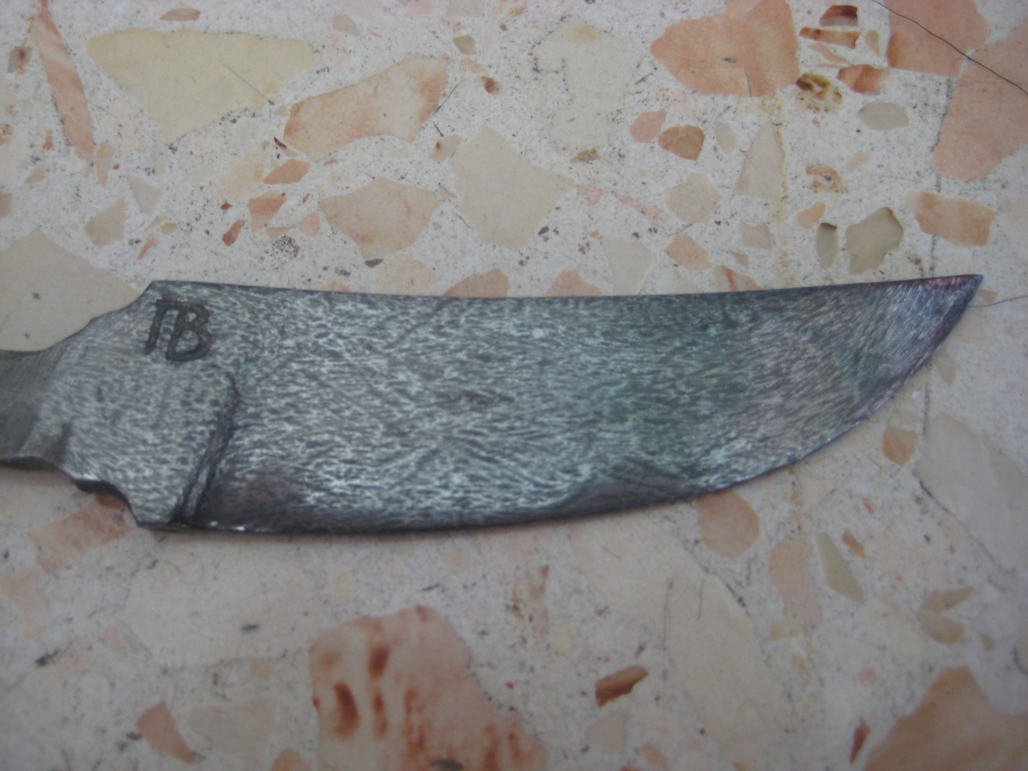 Два нижних  -сталь, просто сталь. Дендритный...красив, узор типа "слоновья кожа", но будет хрупкий в тонкой кромке, на мой взгляд надо интенсивнее ковать...плюс еще кое-что, с опытом. Перетравленный уже лучше, и надо непременно отметить, что травление булатов это особое искусство, некий талант плюс опыт. Я смолично выбросил немало клинков и бывал изрядно удивлен, когда мне показывали роскошные узоры с улыбкой -Ваш, Леонид Борисович!