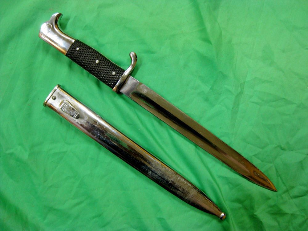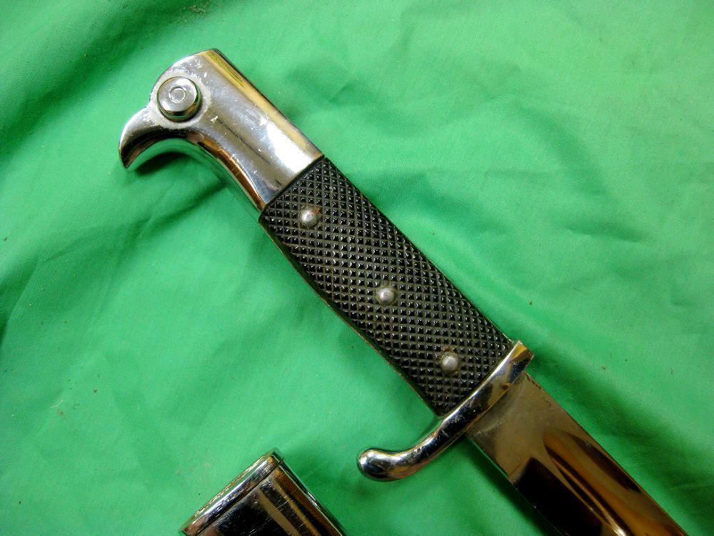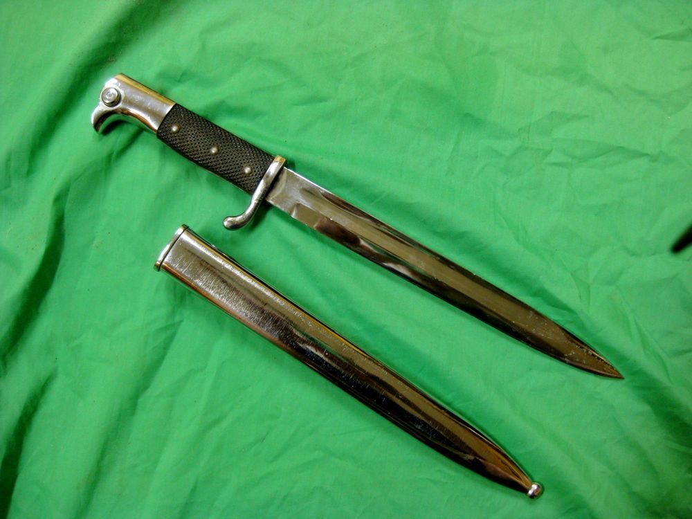 На продажу штык для ношения вне строя,так называемый парадник, KS 98 длинный ,производитель Карл Ейкхорн,Золинген. Клеймо -две белки сидящие спина к спине, применялось с 1906 по 1921.Если ошибаюсь и кто -то владеет более точной информацией по клейму-поправьте,буду только рад.Пластиковые накладки на ручке закреплены тремя заклепками.На внутренней поверхности кнопки есть сборочный номер.Состояние на фото,неплохое.Ножны хромированы ,для самого загадка- то ли это частный заказ военнослужащего страны союзника Германии.После ПМВ германская армия была популярна и моду на ношения вне строевых парадных штыков перенимали военнослужащие других стран.К примеру австрийский парадный манлихер имел хромированные ножны.Или другой вариант-чья-то реставрация для красоты.Цена 700 шек. тел 0542047471.