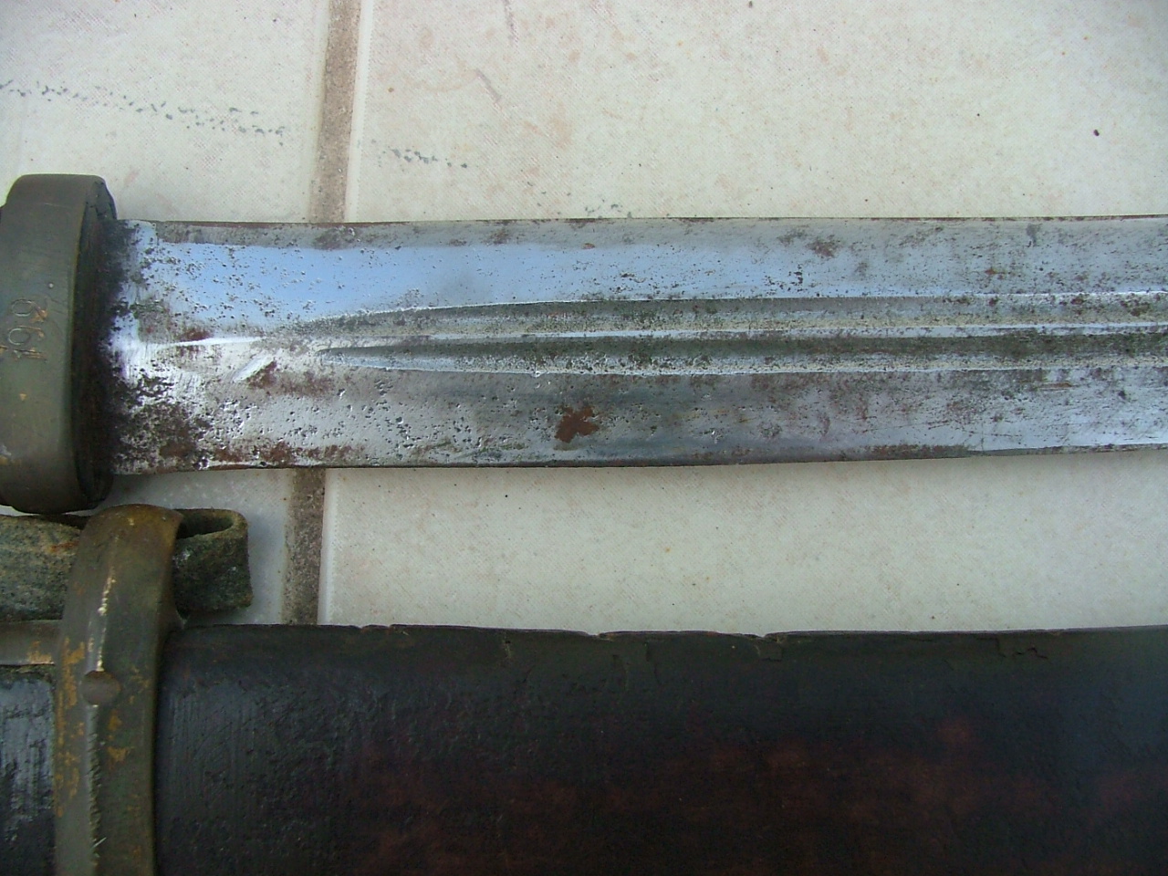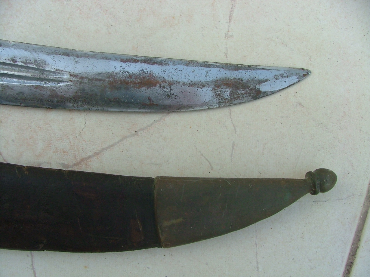 Клинок был чищен и не входит до конца в ножны (видно забиты), кожа потерта и местами треснута.