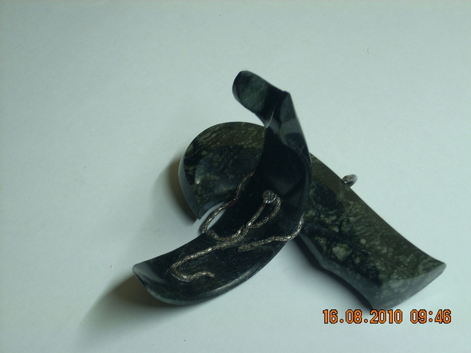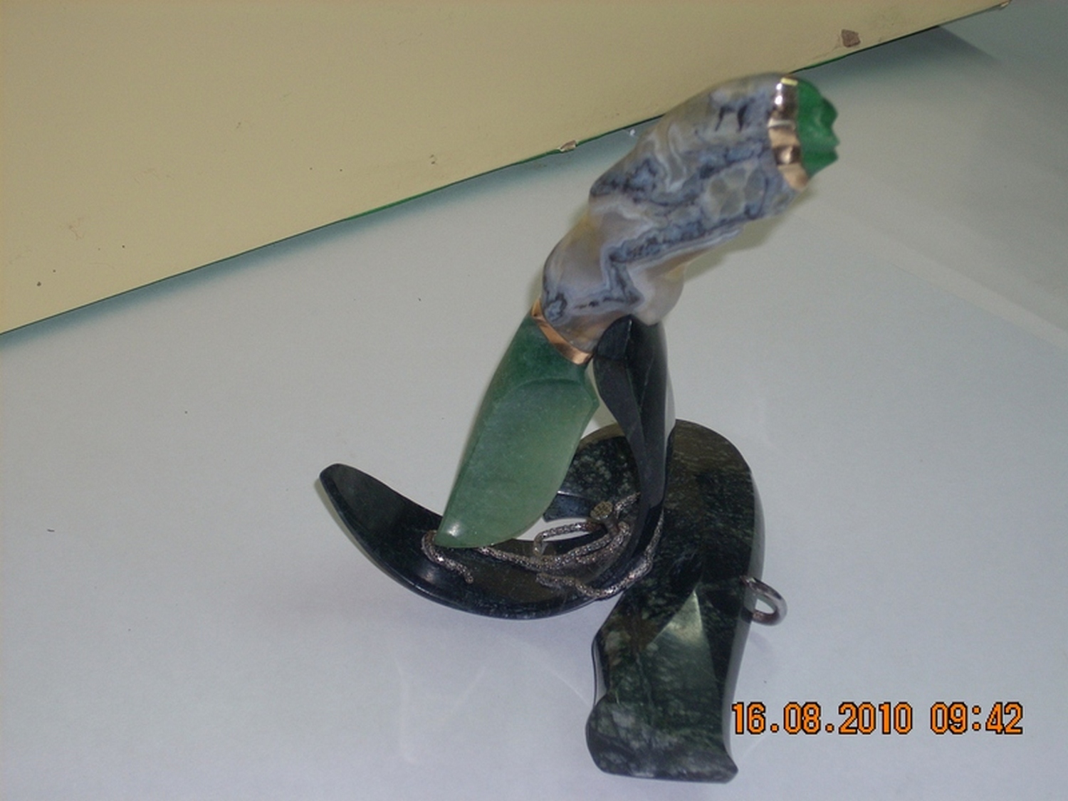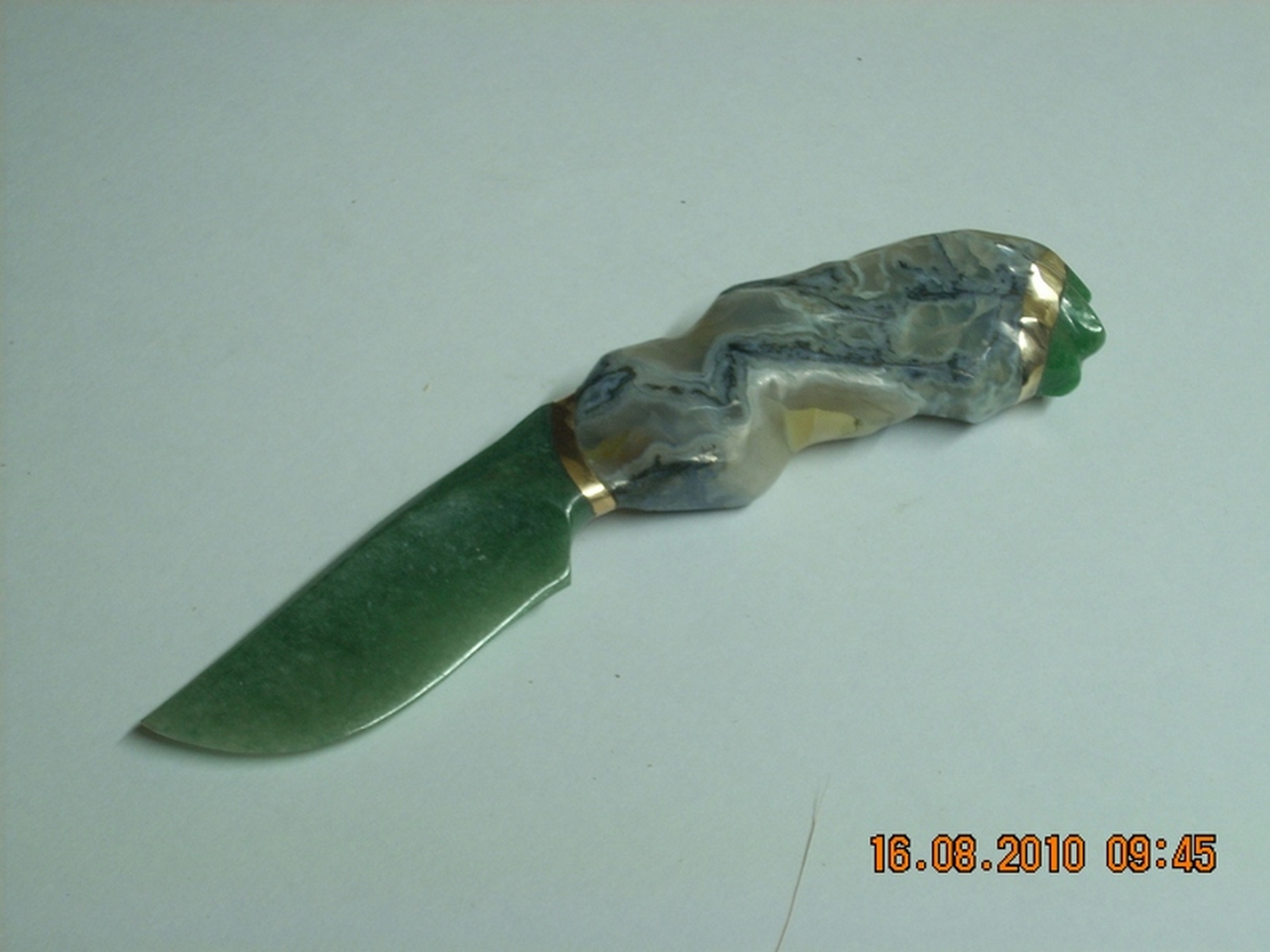 Здравствуйте все!И вот я с новой композицией. Называется-Победитель. Почему? Не знаю. Наверно потому что "гнутый не гнутого несёт".Гвоздик вставил для прикола. Теперь о камне: подставка-местный змеевик(гнутый клинок и рукоять), Победитель-клинок и навершие жадеит(на навершии ювелирный, очень дорогой),вставки- бронза, рукоять-эвенкийский агат. А теперь смотрите, обсуждайте, критикуйте. С уважением я dokavasia.
