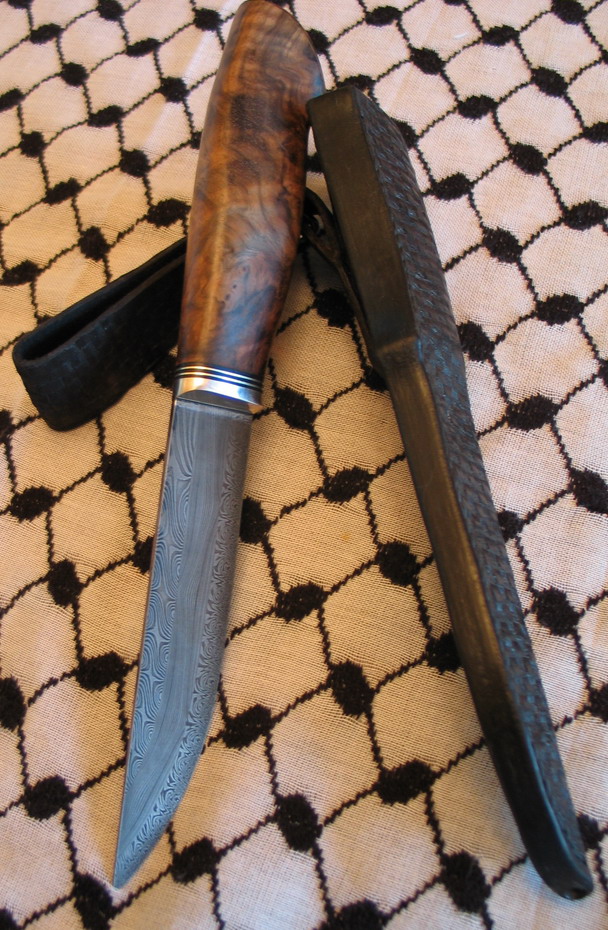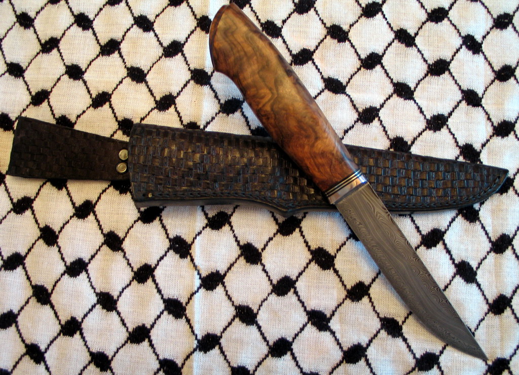 Клинок дамаск 120мм, клин по обуху, прямой клин от обуха, сведение до 0,3мм где то, не заточен, но уже сцуко режет... Рукоять нейзильбер+фибра+то ли корень то ли еще какая-то кучерявая запчасть от кавказского ореха (на Вернике у Лешего брал). Ножны кожа, тиснение хреновиной подаренной на каком то сходняке Геной Бородой. Клин изначально был эдакими наклонными заходами на спуски, не знаю как объяснить... не понравилось, был зверски лишен всяческого тупья, за счет этого длина РК увеличилась на целый сантиметр. Предупреждая вопросы "знатоков" отвечаю флэйм на РК приварен намеренно именно так как приварен. В чисто утилитарных целях, для улучшения качества реза.