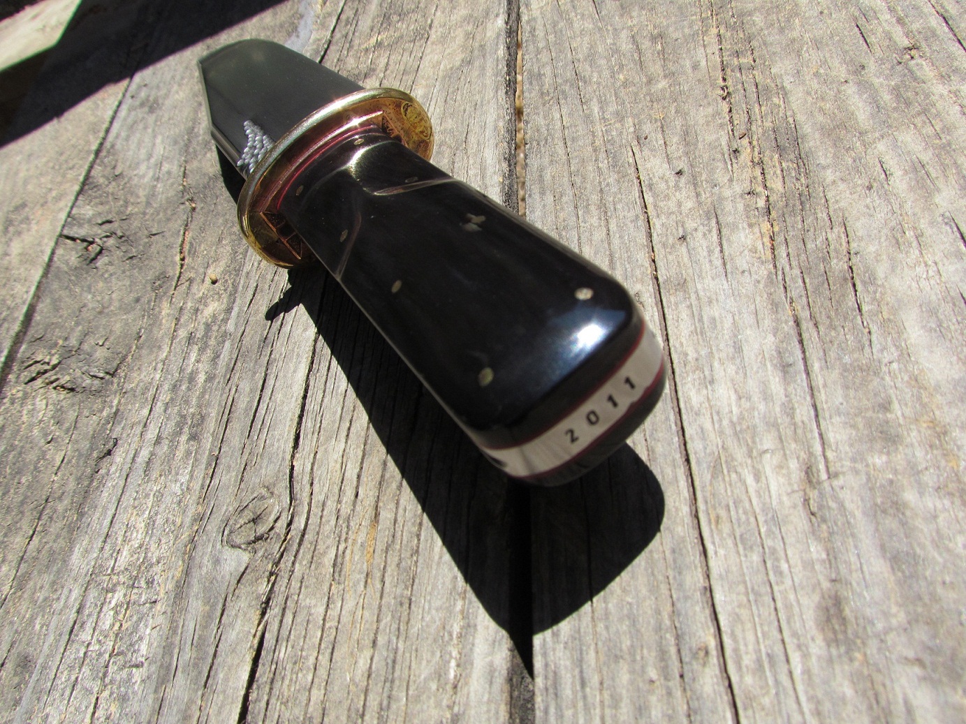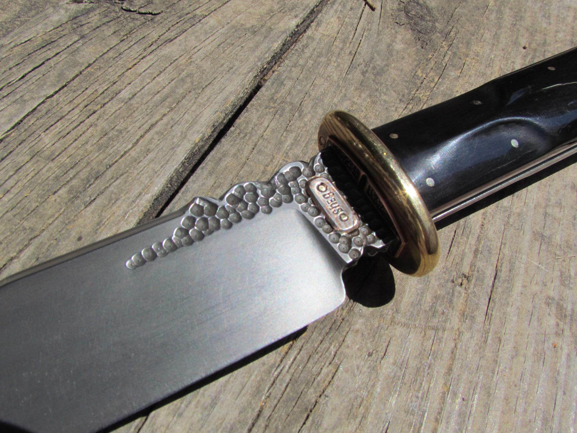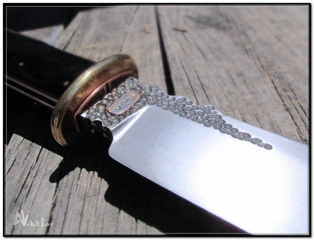 Запрессованные вставки под лого,с двух сторон лезвия,из мокуме на заклепках.