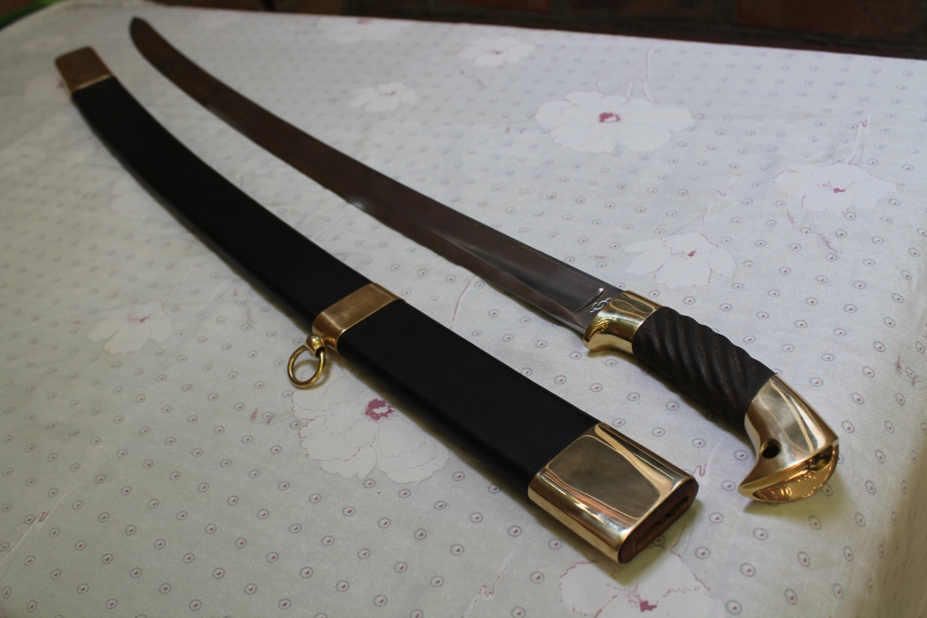 Всем привет! Я снова на связи с миром.И сразу новинка.Клин копия,ст.рессора,откованная,отоженная,потом закаленна по технологии ,да к тому же удачно-прямая,850мм-длинна.Всё остальное отсебятина,клиент не требовал полного повторения оригинала.Латунь,ясень,ножны авиац. фанера,обтянутые кожей
