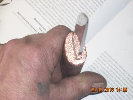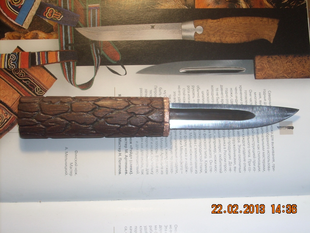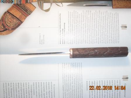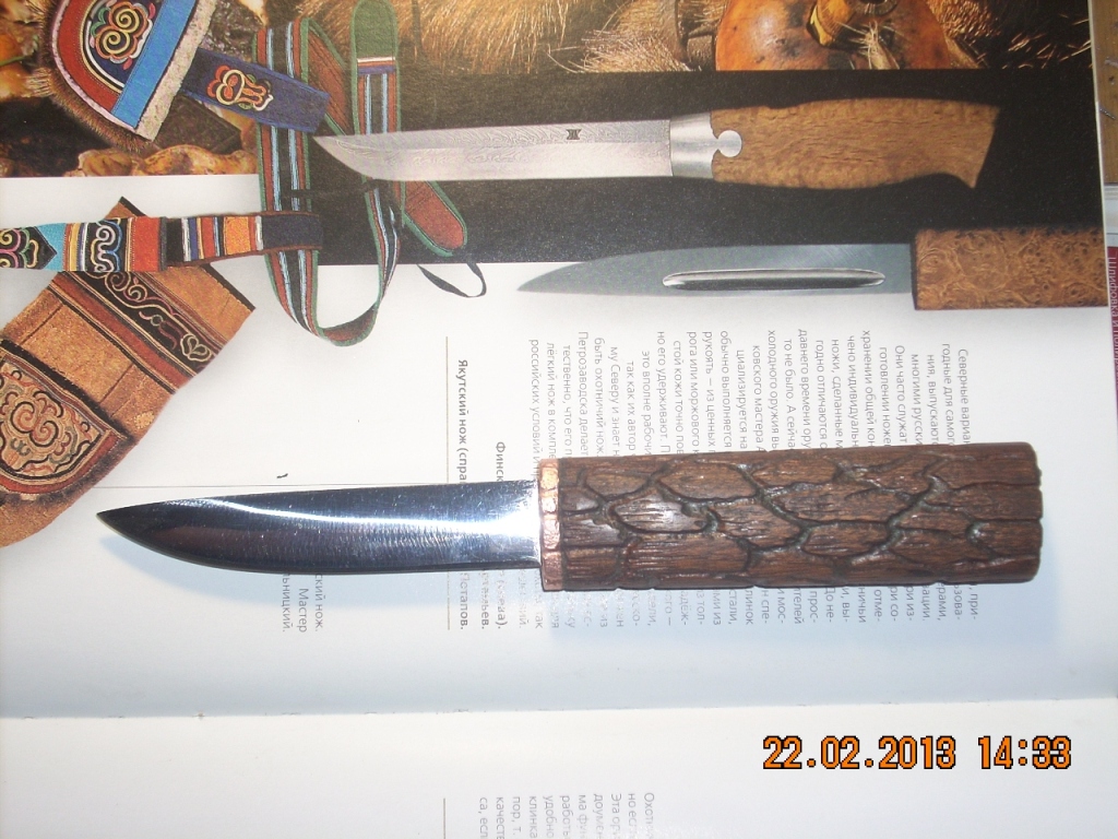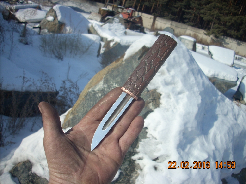 Приветствую всех! Как обещал, так и сделал ножик, по мотивам Якутский нож.Прежде чем начинать, внимательно прочитал тему "Якутский нож".Особенно внимательно прочитал про дол. О его происхождении у якутских ножей, а не для чего он нужен. Вчера с утра нашёл обойму подшипника, разрезал, нагрел в печке, распямил. Затем на черновую  выточил клинок. В этой же печке закалил его, сделал отпуск где-то 1час и завершил окончательную обработку клинка. Дерево на рукоять взял махагони (прислали ребята из Израиля). Ну для больстера взял медь. Они по цвету друг другу подходят. Прав я или нет, но на некоторых якутах видел больстер. Ну вот кажется и всё об этом.