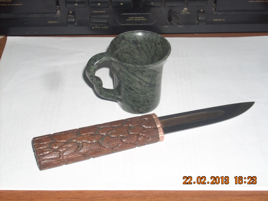 А эту кофейную чашечку из серпентинита сделала и подарила на день Защитника Отечества моя помощница Елена.
