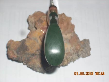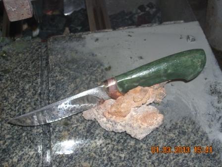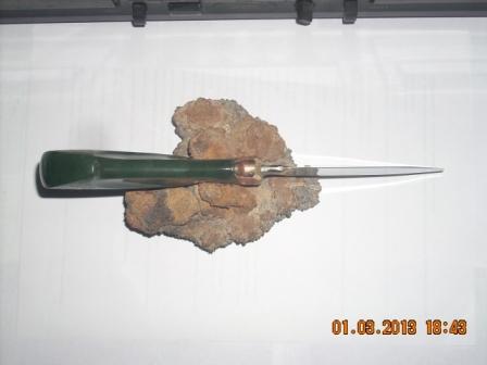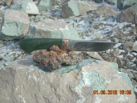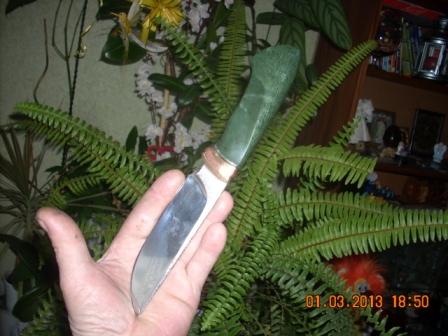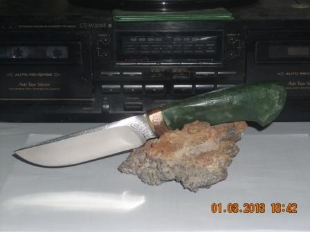 Ну наконец-то сделал я ножик из хорошего металла. Подарили мне пластину из К110 уже калёную, австрийской фирмы Бёллер. Ну очень твёрдая. Два дня выгрызал из неё клинок. Обрабатывал на наждаке и алмазным инструментом. Обрабатывал на наждаке не перегревая, осторожно. А алмазным инструментом ессно с водой. На рукоять использовал нефрит. Больстер слоёный . С наружи бронза, в середине медь. Паял на серебро. Монтаж всадной на бокситку. Длина пластины была 200мм. Использовал 195мм. Длина клинка - 120мм. Ширина - 30мм. Общая длина - 245мм. Сведение меньше 0,5мм.  Немного заточен. Подставка - самородная медь. Не большую прорезь для ножа сделал и больше не трогал.