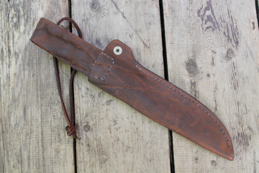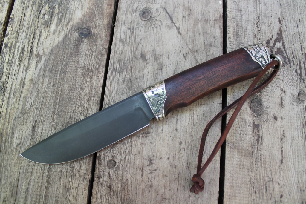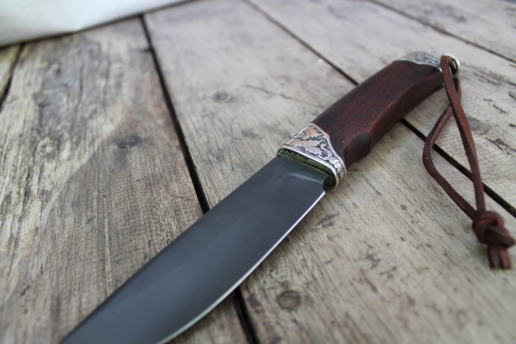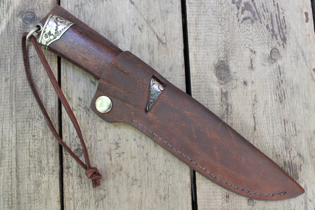Клин:124-30-3,5мм, кованный быстрорез р6м5, твёрд.-58-59ед., хвост.- 75мм, монтаж всадной. Ручка - 125мм с пипкой из нержи, кольцо - мельхиор, спаяно. Какое-то красное дерево, потемнённое, листовой мельхиор, пайка, гравировка. Ножны - кожа. Нож уже продан, но советы жду.