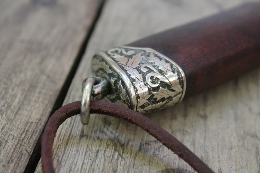 Недавно переделал ножик с гравировкой. Была тема на Вашем форуме - "Прошу совета". Нож "завис", потом и самому перестал нравиться - решение одно: переделка. Лезвие и обоймицы оставил, переделал деревяху, добавил пипку. В процессе переделки повредил покрытие, пришлось травить в ХЖ.