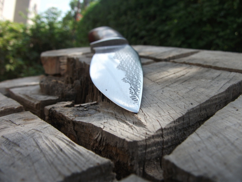 Клинок сведен от обуха в 0,2мм, трех слойное травление, заточен до строгания человеческого волоса
