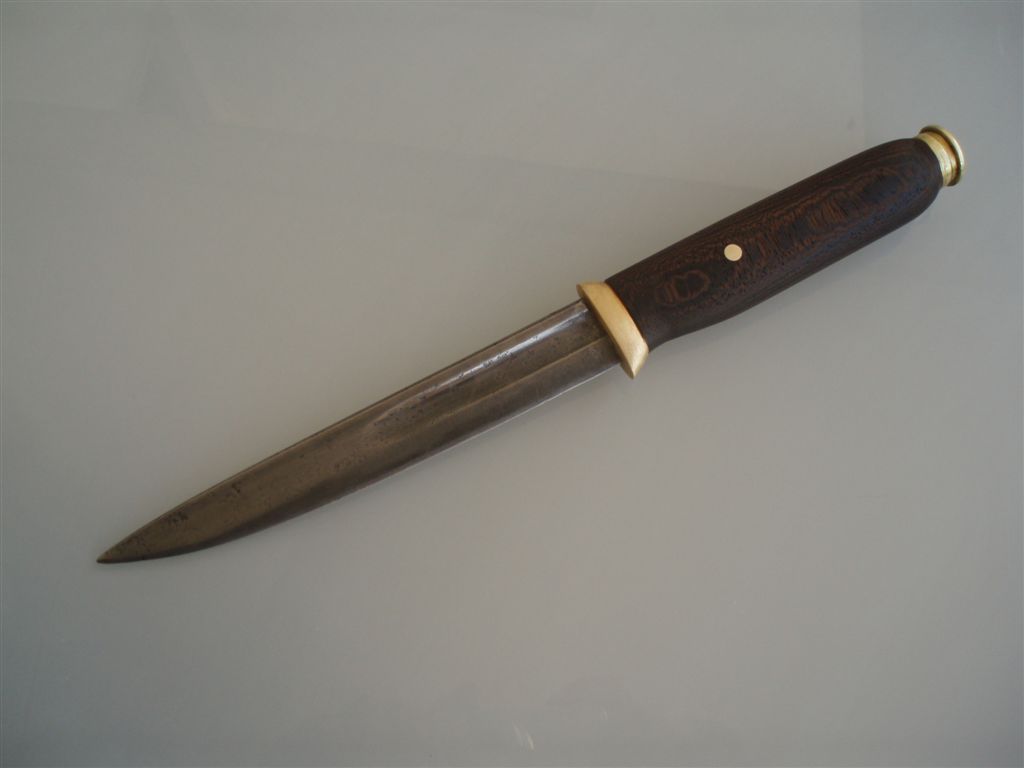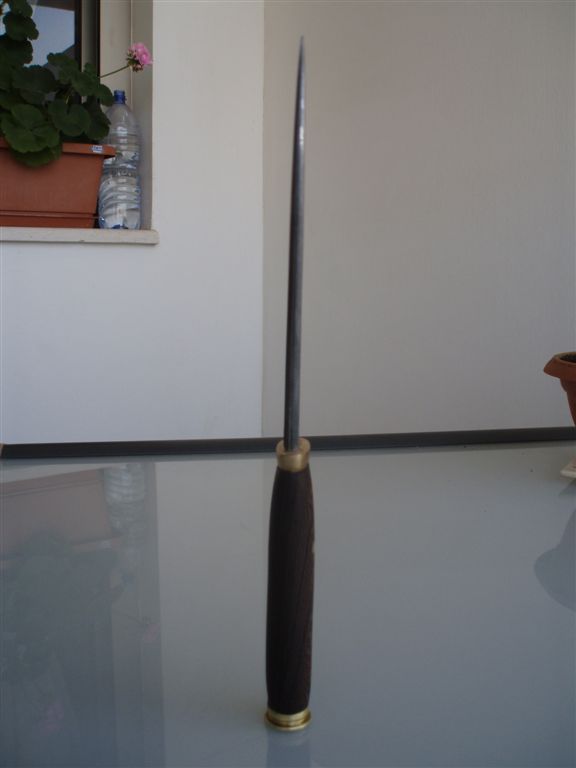 Символично , что британский штык , через арабские ручки попал еврейским парням .Не хотелось делать его слишком красивым , а сохранить милитаристский дух . На рукоять пошел кусок венге от Isragever , гарда - латунь ( пришлось повозиться , т.к. это обломок штыка и кровосток заходит в рукоять ) , тыльник -капсульная часть патрона калибра .50 . Пришлось на тыльнике подставить кожу .