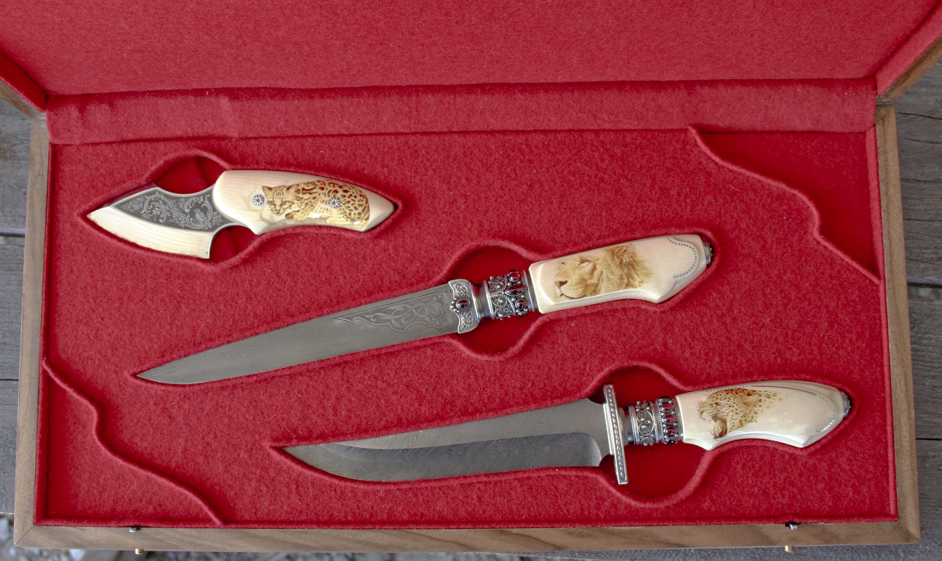 со львом - булат Лунёва, на маленьком ноже - клинок из стали "Люся".