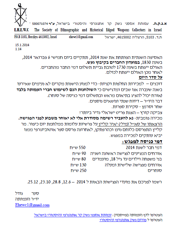 На всякмй случай, сообщаю, что встречи амуты א.נ.ק.ה переносятся с обычного места в Герцлии Питуах, в кибуц Гааш (несколько километров севернее по квиш 2). Перенос вызван финансовыми причинами, проистекающими из апетитов администрации гостиницы и повлечет за собой некоторое снижение цен. Ближайшая встреча - 06.02.14