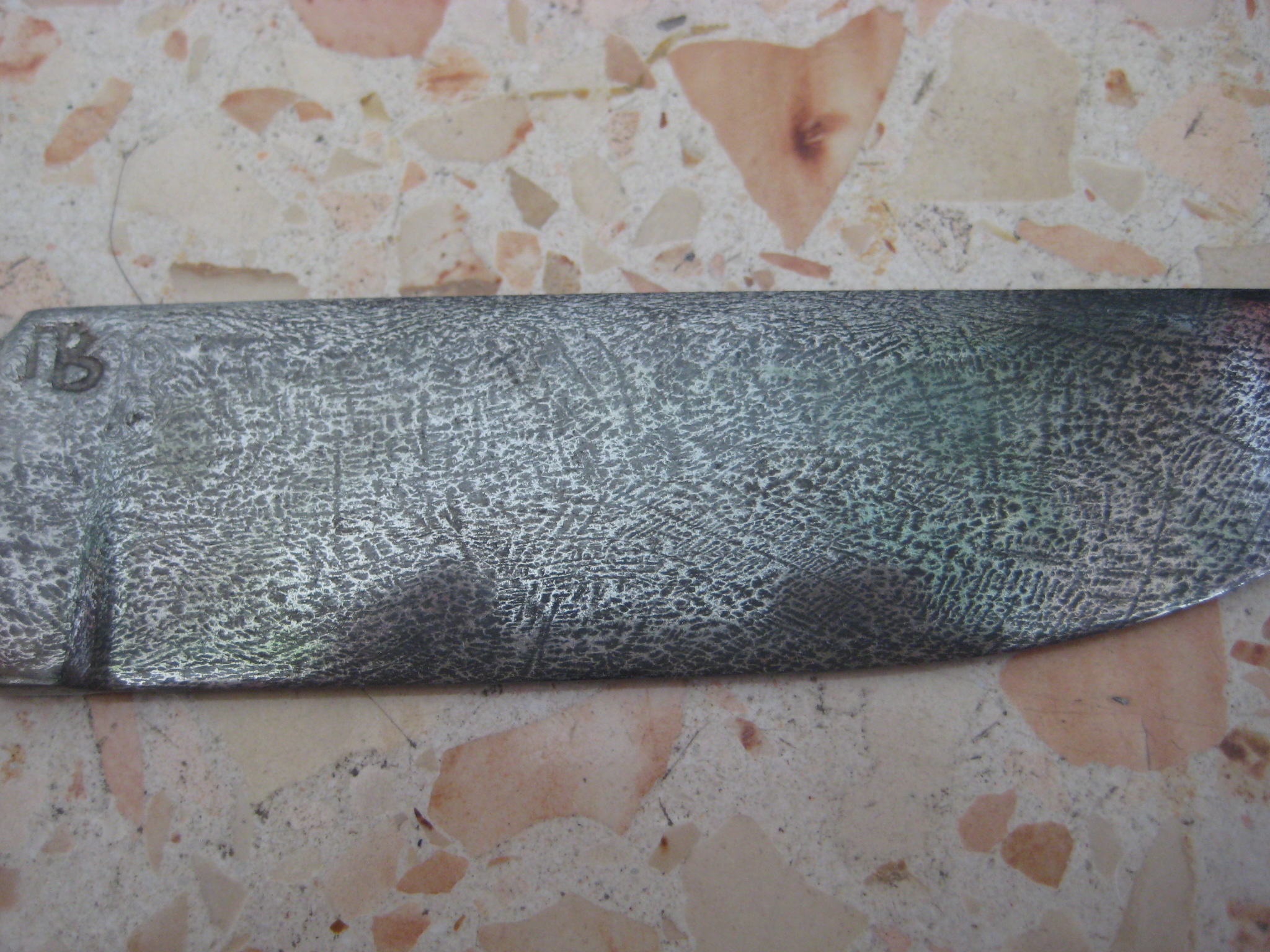 вы были правы. что клинок перетравлен.пришлось перешлифовывать его заново.убрал где то 1.5мм от общей толщины.перетравливал его в лимонной кислоте за неимением больше ничего подходящего.пробовал травить в электролите.результат 0.вот что получилось .
