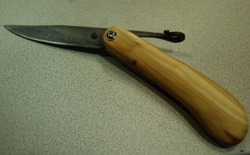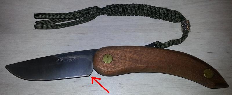 Пришел с внутренним штифтом (не сквозным) и с ужасной заточкой (кстати, кончик клинка срезан с одной стороны на ~1мм "ручной" заточкой).