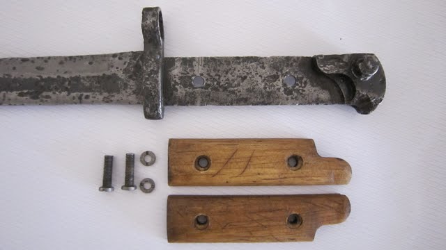 Ни разу не видел, чтоб накладки в штыках сажали на эпоксидку, обычно или на заклепку или на болт с гайкой. Кулинский пишет, крепление двумя винтами. Попробуй поискать в нете, может найдешь фотографии гайки и винта с разных ракурсов. Но мне кажется, что этот штык "мертв" и возни не стоит.