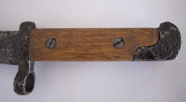 Все таки решил немного отреставрировать, как сумею: еще чуток почистил от ржи стальной щеточкой на Dremel'е. Сделал накладки из бука. Оказалось не так просто, потому что не нашел чертежа, да к тому же на внутренней стороне есть небольшая "ступенька". В общем засунул сам штык в копировальную машину и работал по этой копии. После понасажал царапин. Старил дерево марганцовкой (откопал в нете рецепт, если кому надо, скину ссылку), и пропитывал/затемнял смесью льнянки с пчелиным воском и трепентином. Винты/гайки переделывал из того, что было, старил сначала хлорным железом(Спасибо Диме аkа Pesel), а потом сановским антикальком, в нем 15% ортофосфорки. В конце покрыл штык и накладки ренесансом.