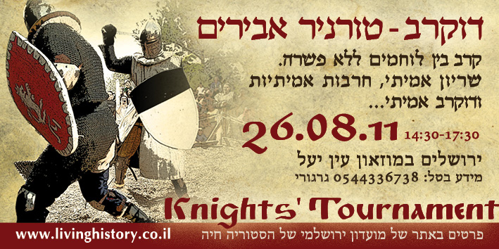 2. На турнире будет отобрана израильская сборная, члены которой скрестят клинки с иностранными участниками на фестивале "Рыцари Иерусалимского Королевства". Фестиваль "Рыцари Иерусалимского Королевства" традиционно состоится на Сукот (середина октября, 2011года). А потом у нас будет возможность узнать кто из нас лучший в личном зачёте.