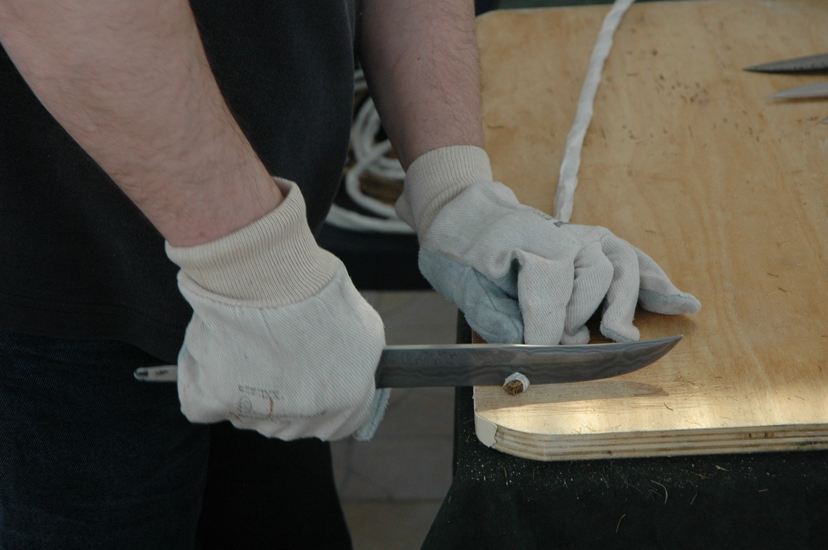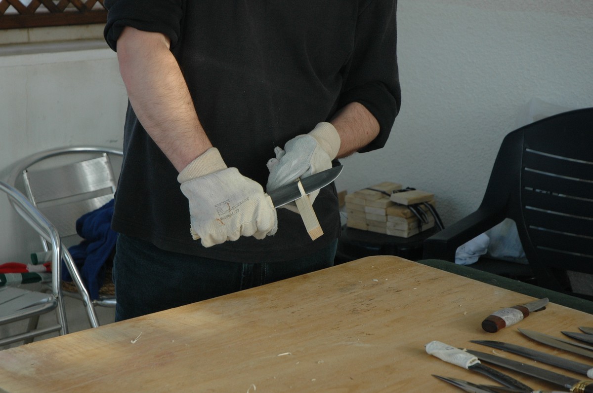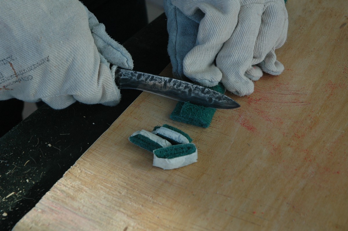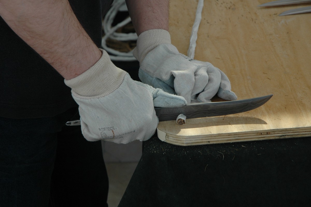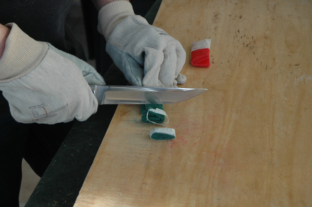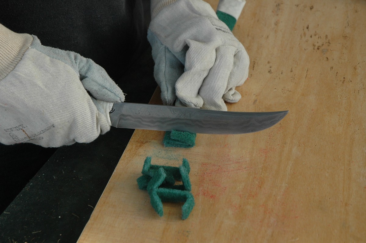 Тут вроде бы наметилось некое улучшение, несмотря на такой непростой материал для теста. По крайней мере, первые пару резов нож сделал четко и без излишнего напряга. Потом окончательно стал сопротивляться при резе, норовя выскочить из руки. Поменяли угол реза, но, увы, нож тут же сел окончательно, перестав даже надрезать. Пришлось остановить тесты, смирившись с положением…
