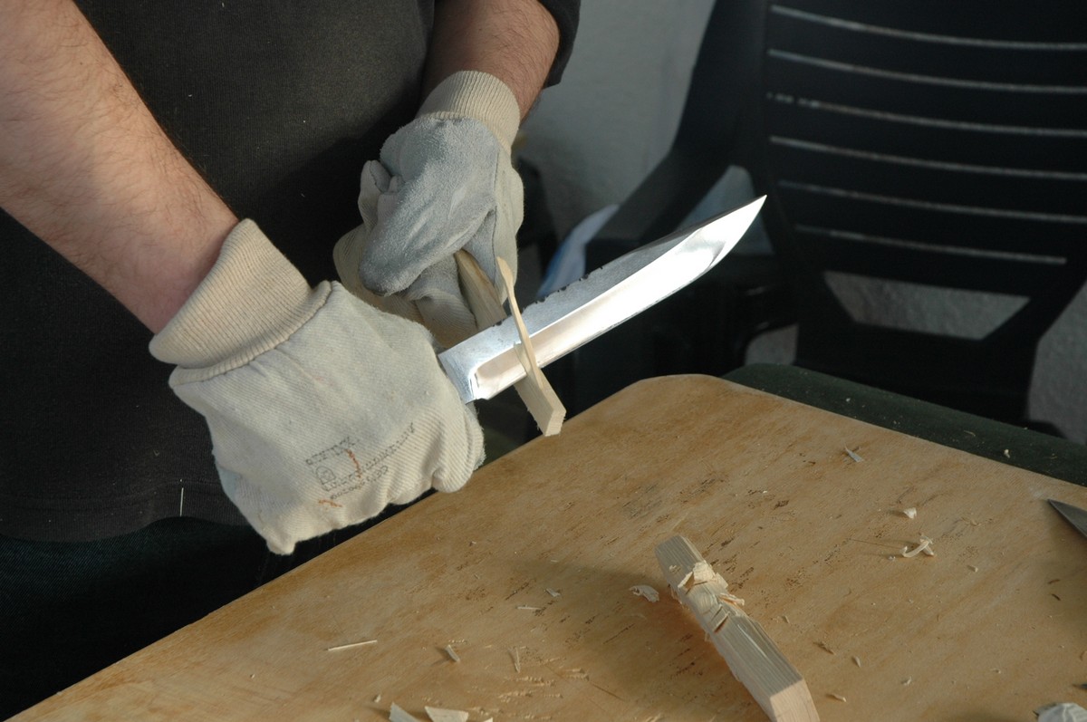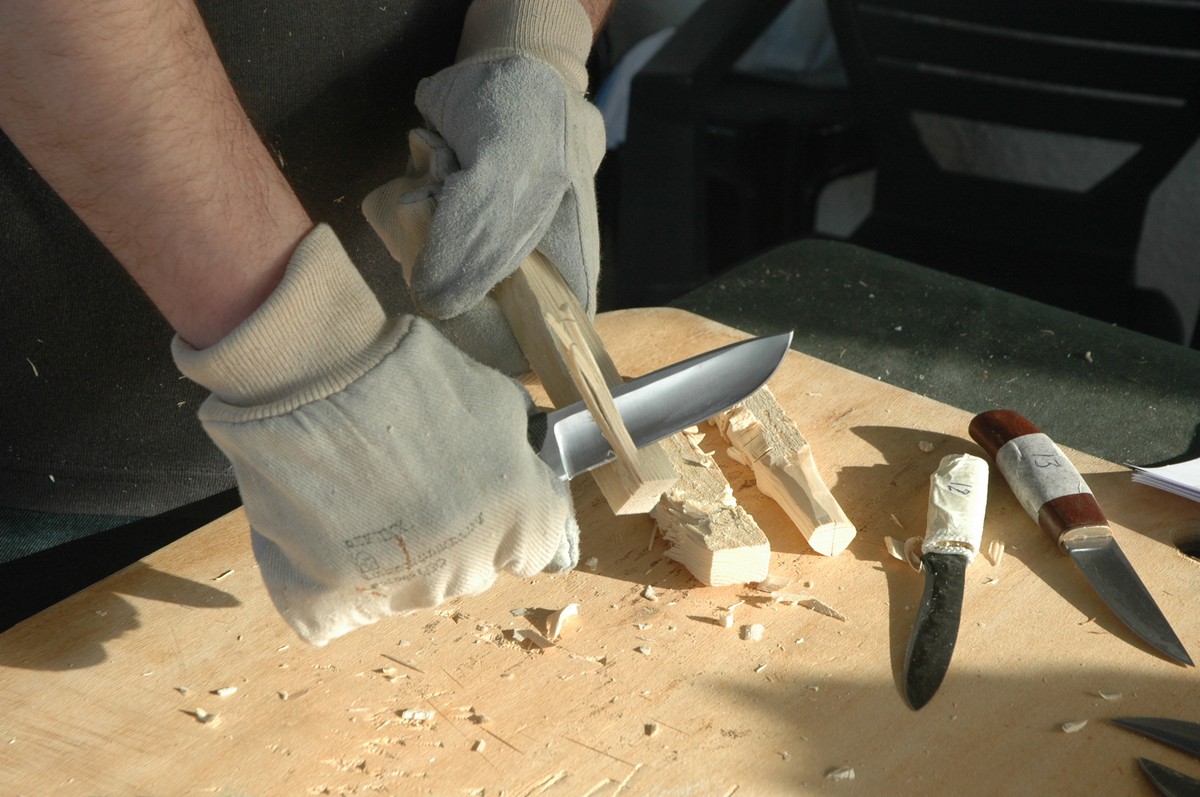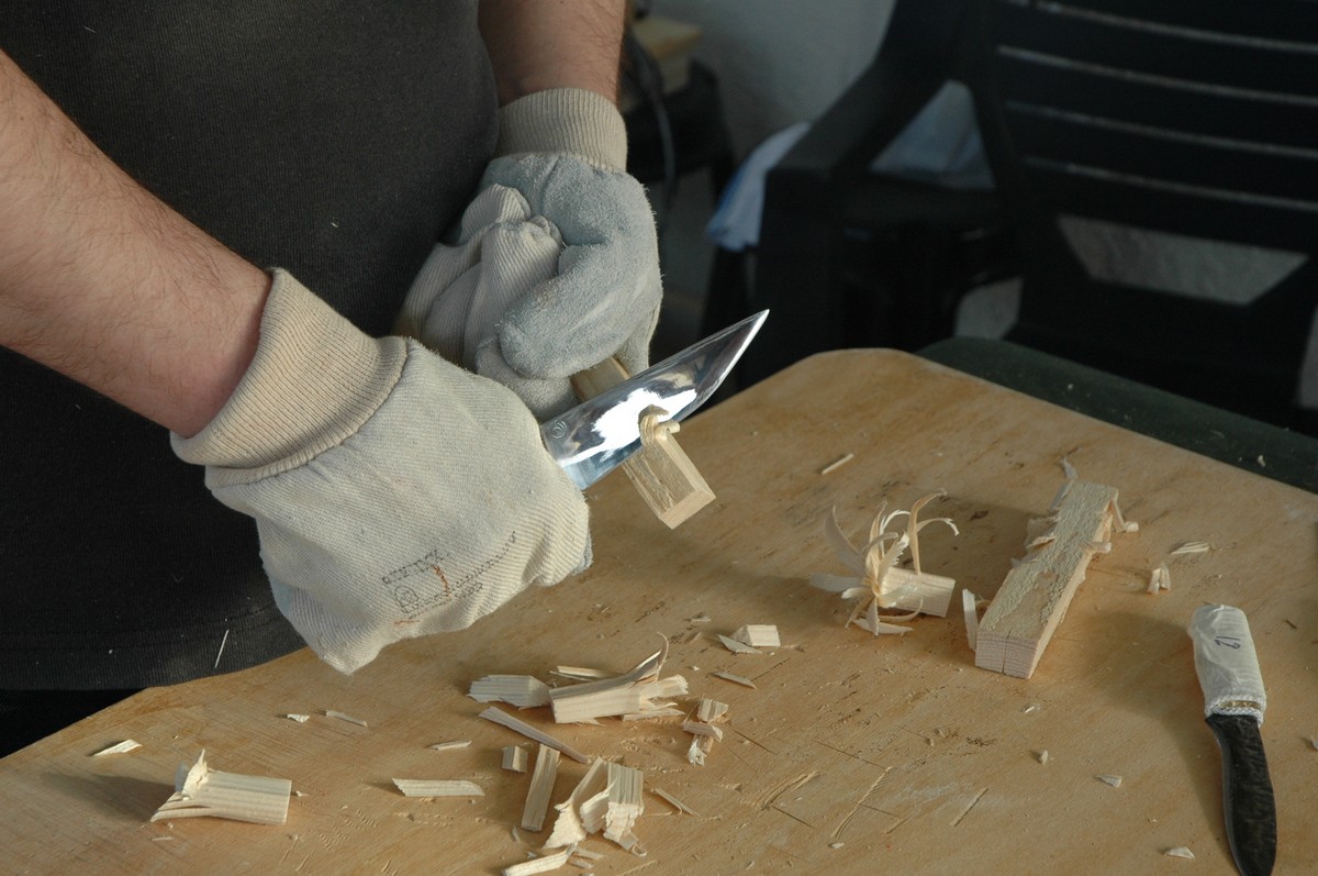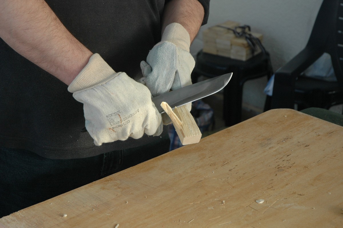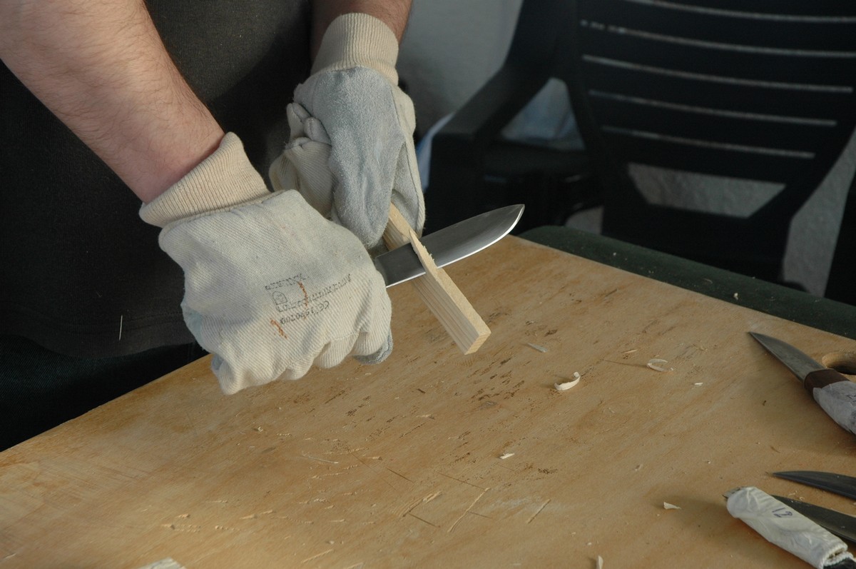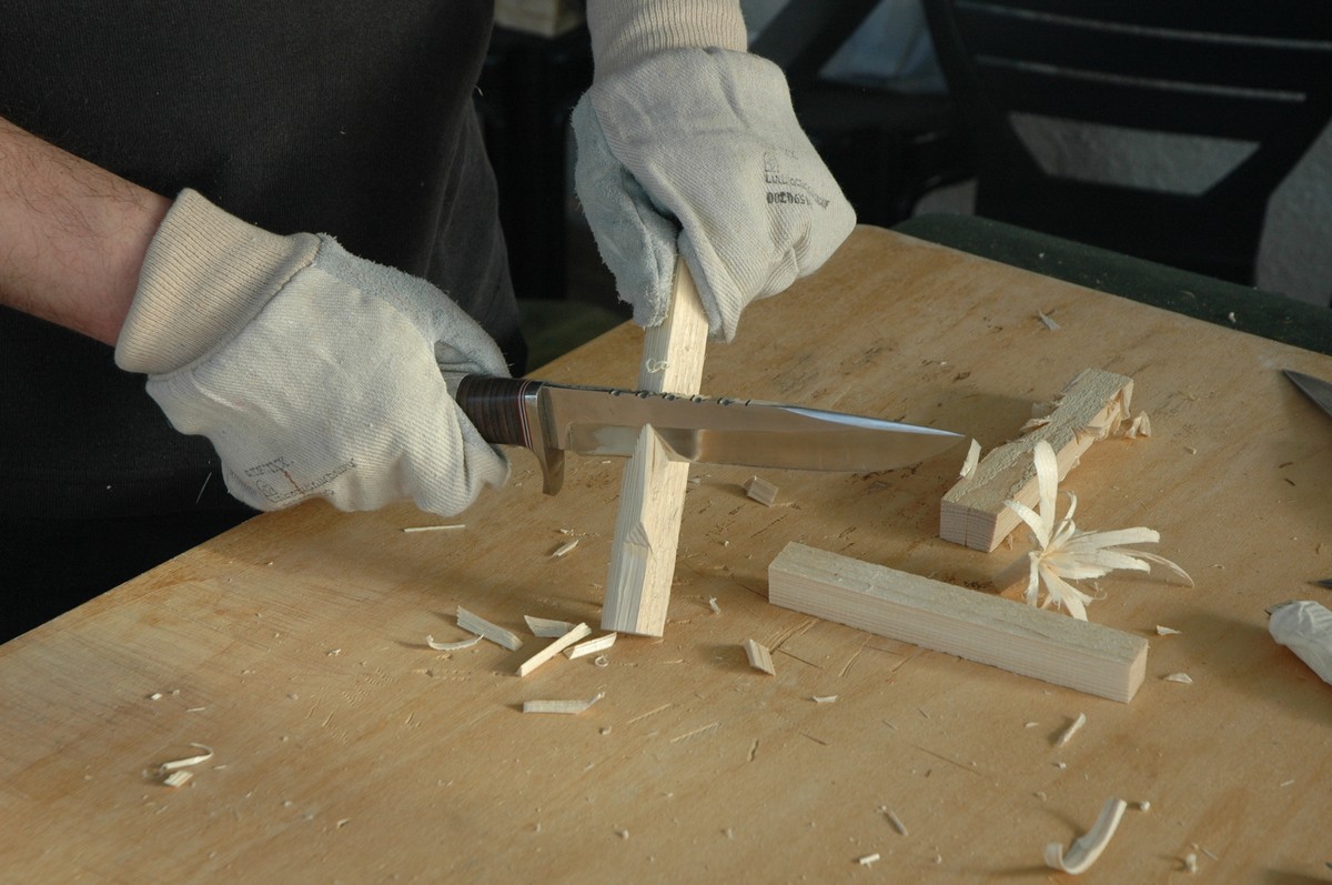 Мы уже как-то настроились на то, что нож показал результаты, указанные выше. И посему к строганию подошли со всей ответственностью, учитывая опыт удержания этого ножа с такой узкой рукоятью. Дощечку он не расколол, но этого и следовало ожидать, учитывая слишком легкий клинок. Строгать вроде бы было удобно, контролировать можно легко процесс, но, увы, нож строгал крайне неохотно. Стружку снимал с трудом, отщипывая щепу небольшими кусочками. И стал вязнуть в дереве после нескольких движений. Построгав еще немного для проформы, мы прекратили, поставив 2 балла.