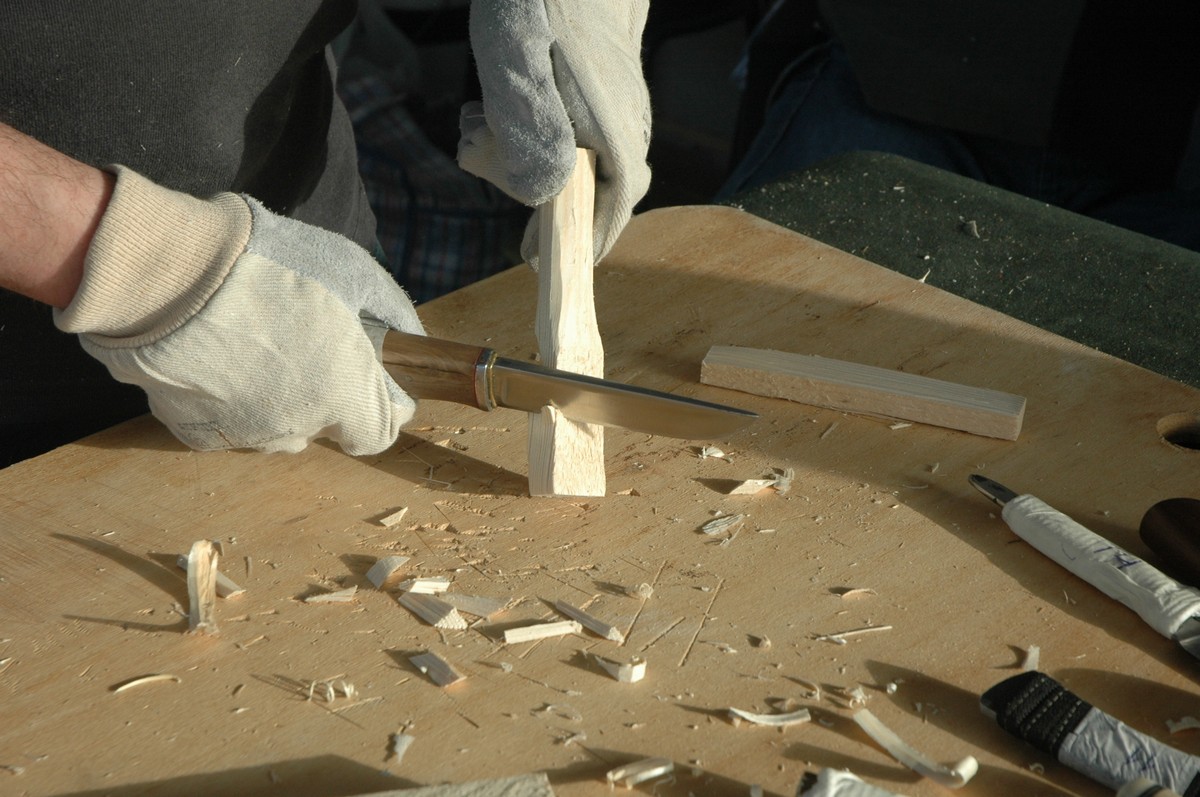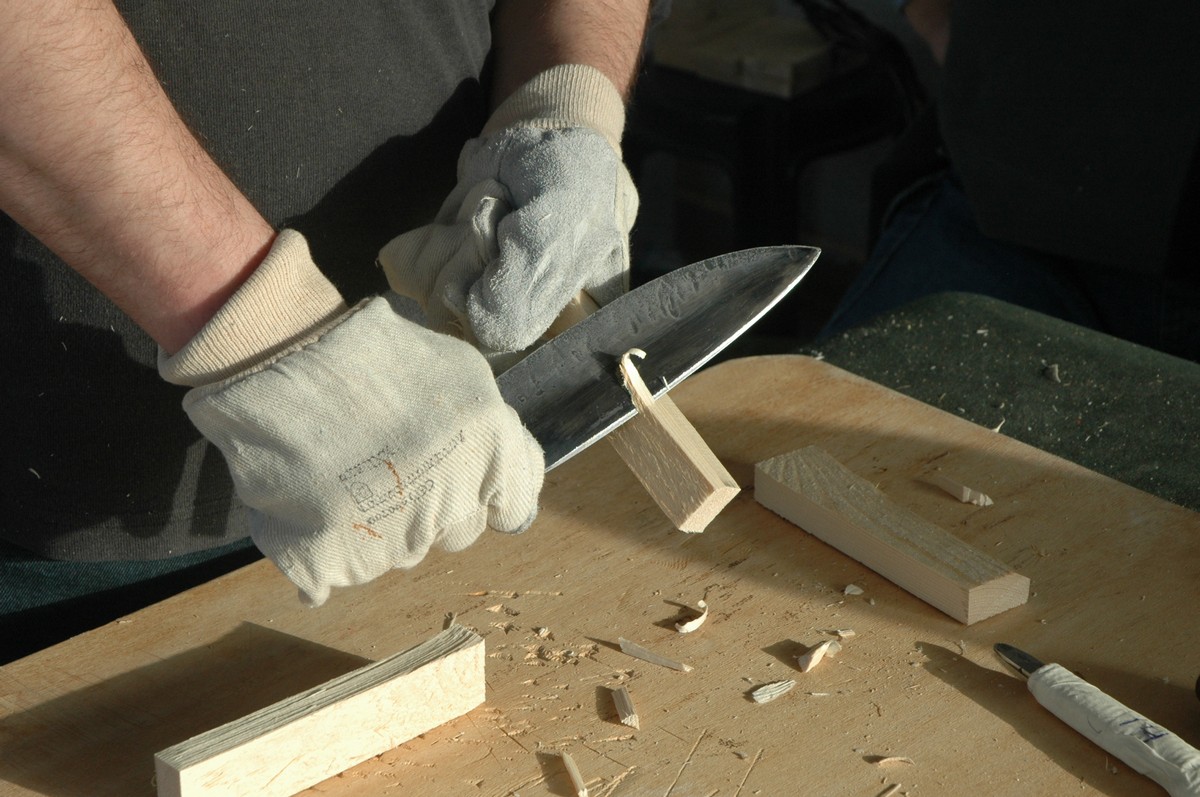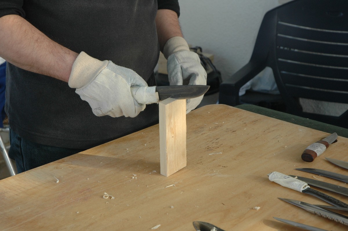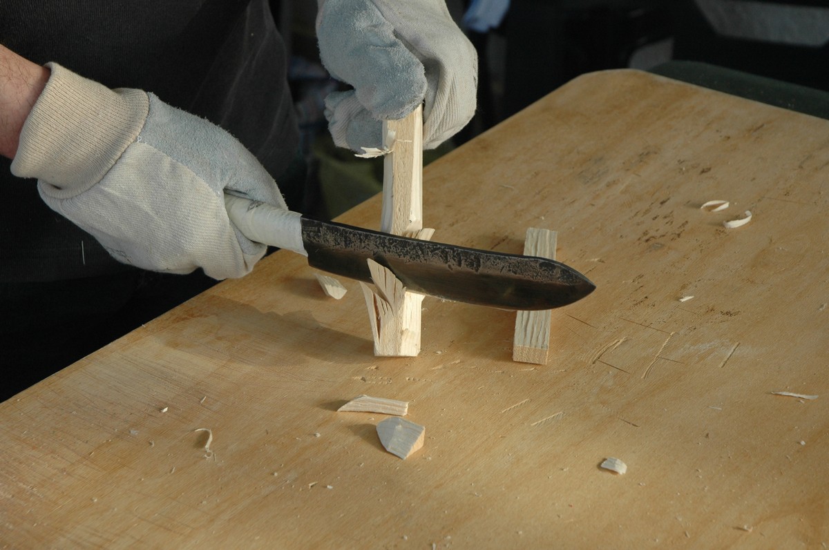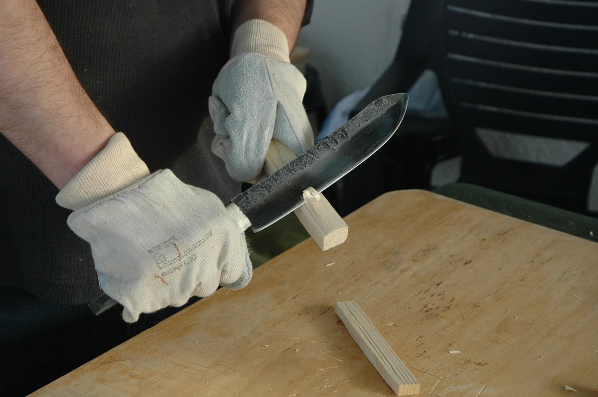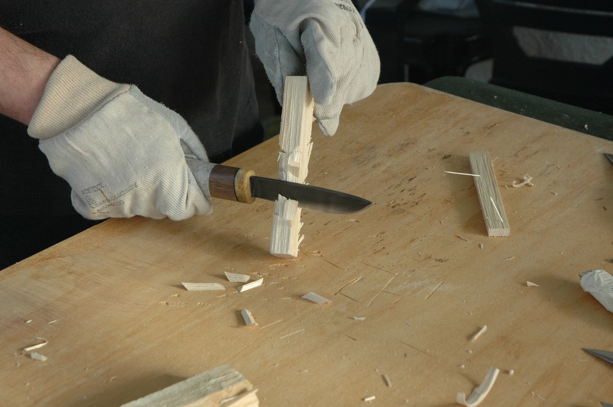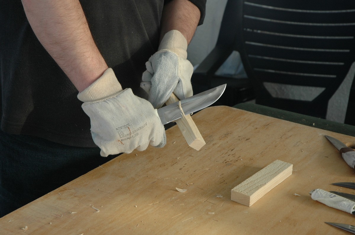 Мы уже как-то настроились на то, что нож показал результаты, указанные выше. И посему к строганию подошли со всей ответственностью, учитывая опыт удержания этого ножа с такой узкой рукоятью. Дощечку он не расколол, но этого и следовало ожидать, учитывая слишком легкий клинок. Строгать вроде бы было удобно, контролировать можно легко процесс, но, увы, нож строгал крайне неохотно. Стружку снимал с трудом, отщипывая щепу небольшими кусочками. И стал вязнуть в дереве после нескольких движений. Построгав еще немного для проформы, мы прекратили, поставив 2 балла.