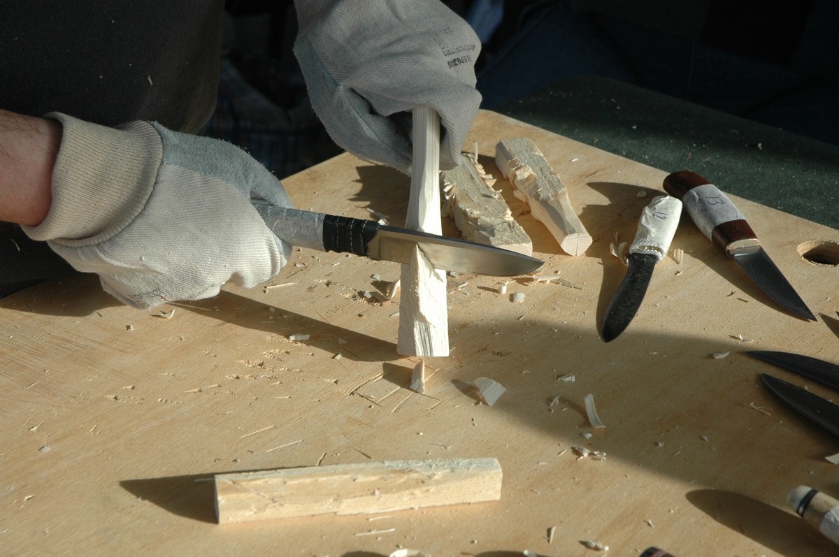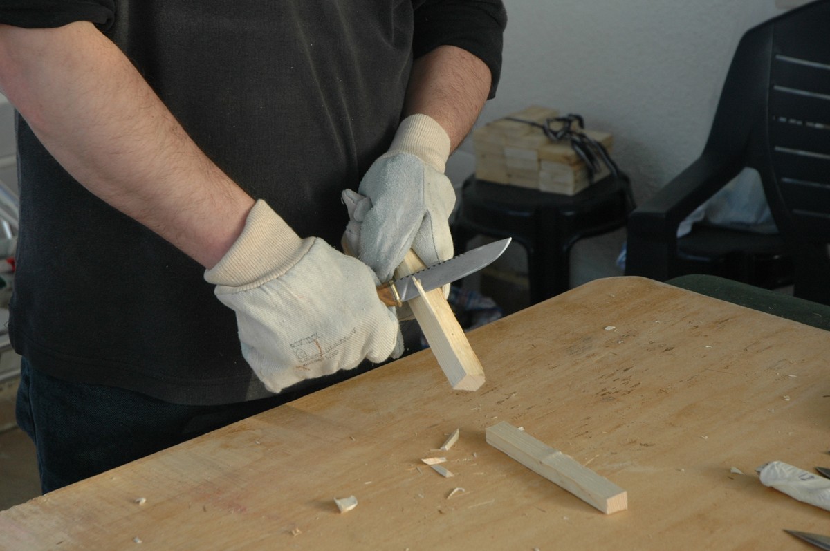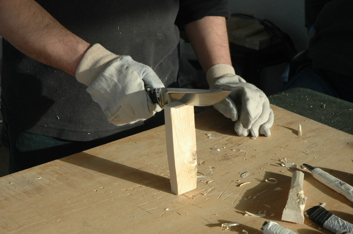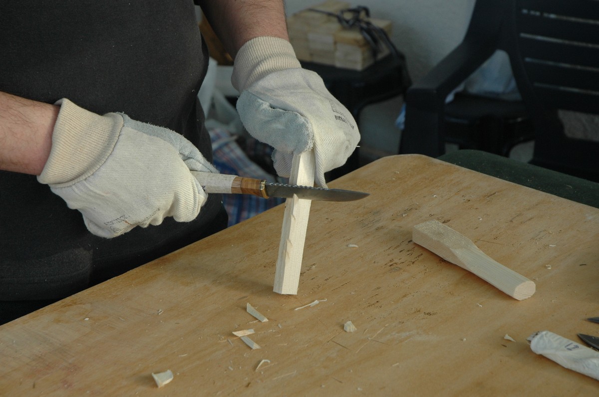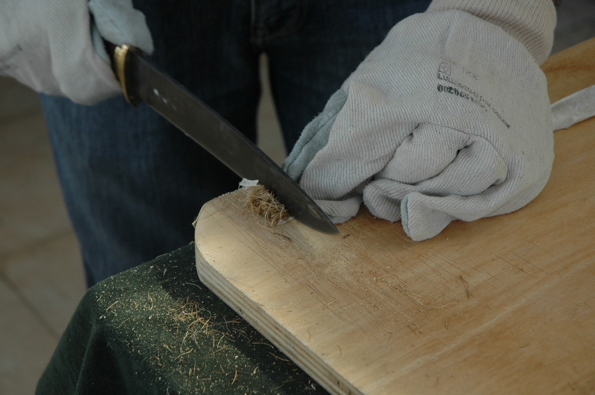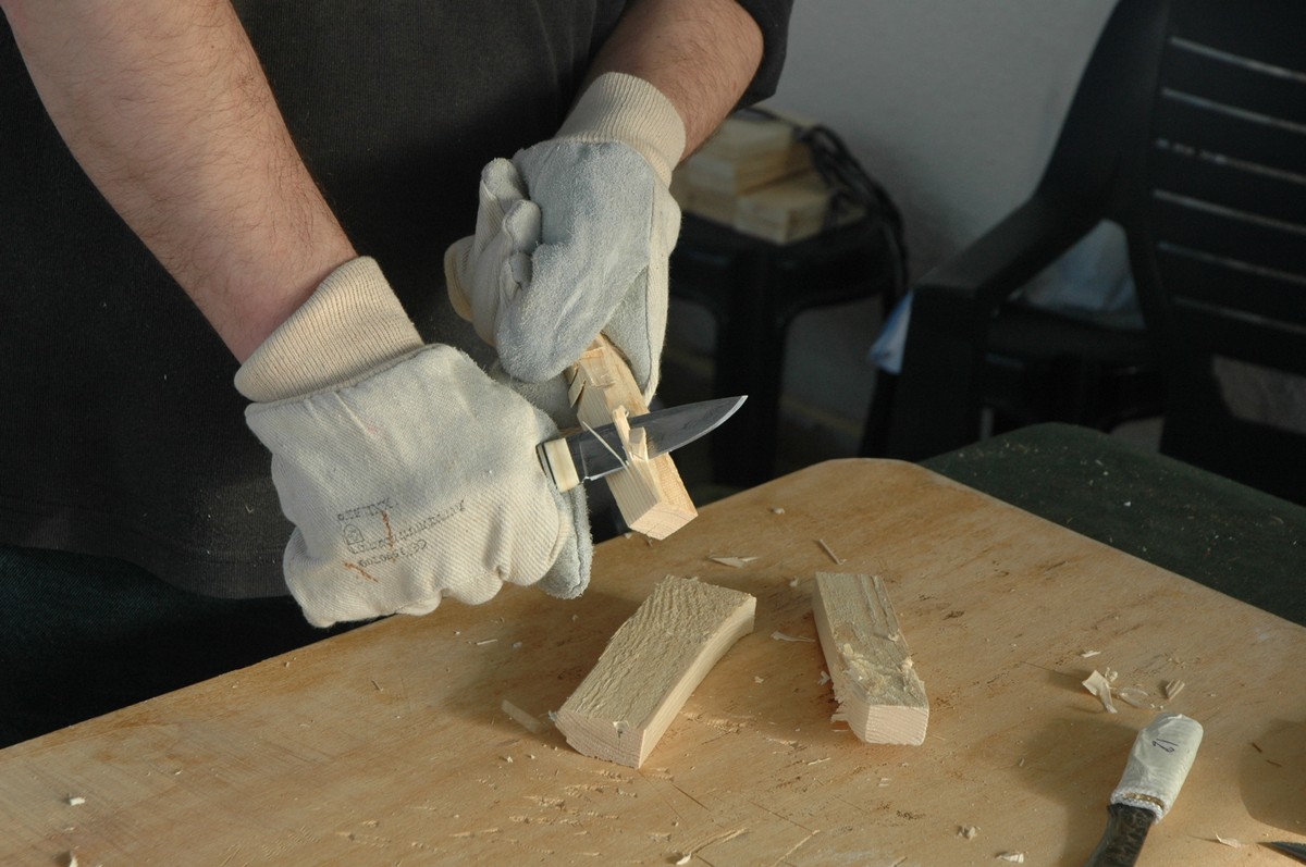 Мы уже как-то настроились на то, что нож показал результаты, указанные выше. И посему к строганию подошли со всей ответственностью, учитывая опыт удержания этого ножа с такой узкой рукоятью. Дощечку он не расколол, но этого и следовало ожидать, учитывая слишком легкий клинок. Строгать вроде бы было удобно, контролировать можно легко процесс, но, увы, нож строгал крайне неохотно. Стружку снимал с трудом, отщипывая щепу небольшими кусочками. И стал вязнуть в дереве после нескольких движений. Построгав еще немного для проформы, мы прекратили, поставив 2 балла.