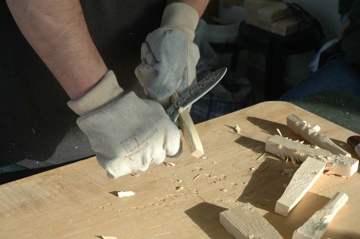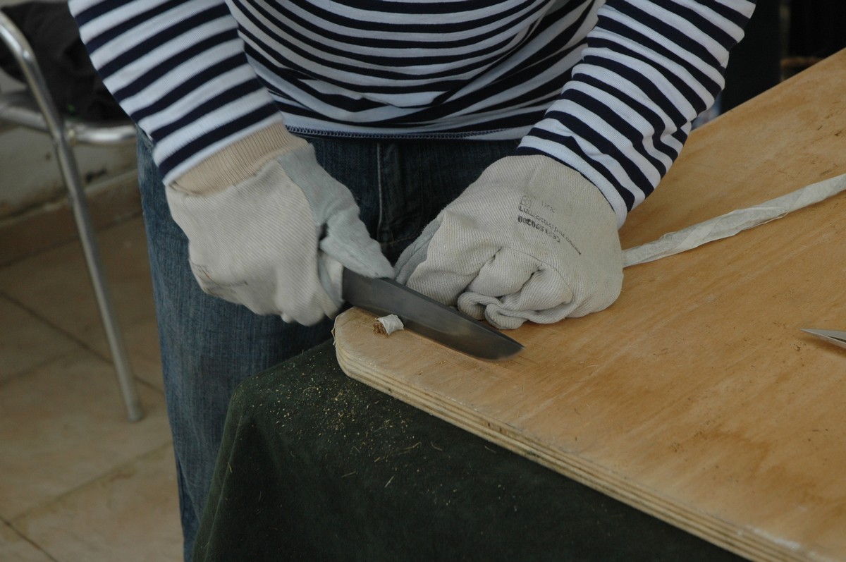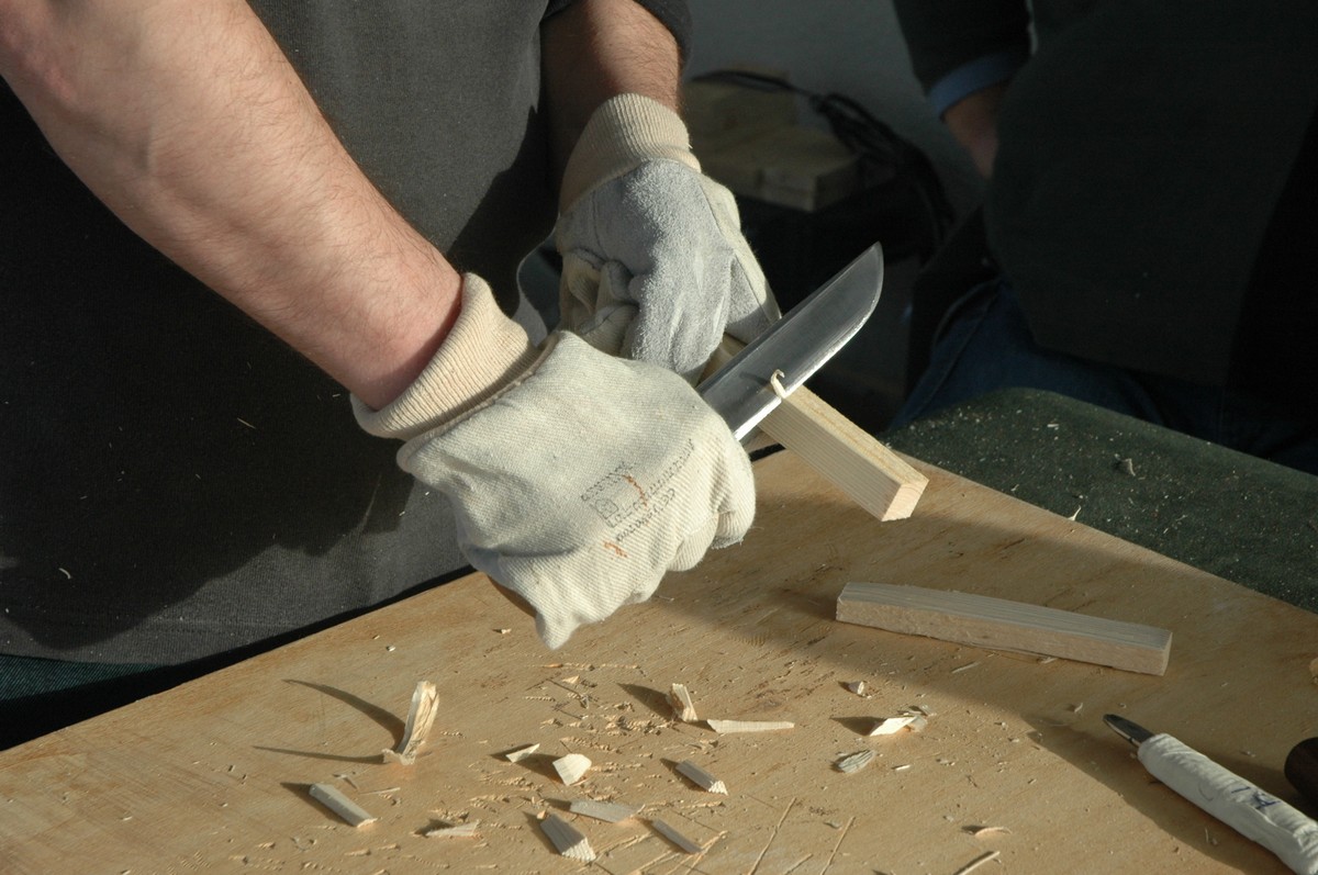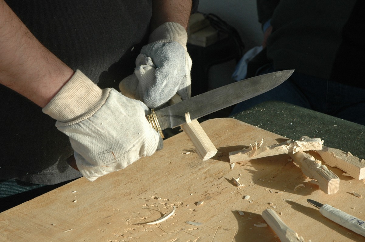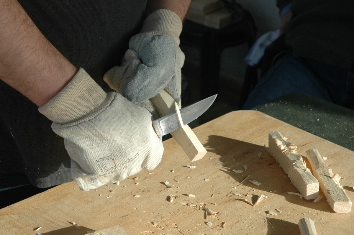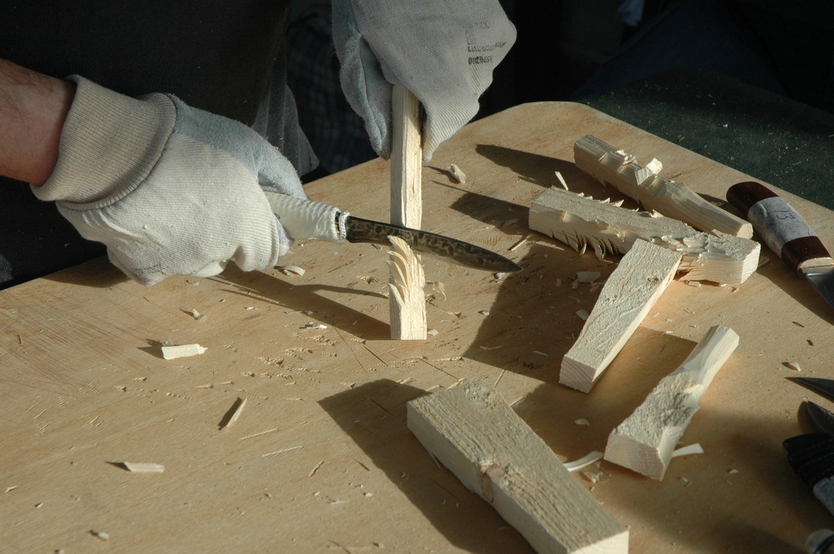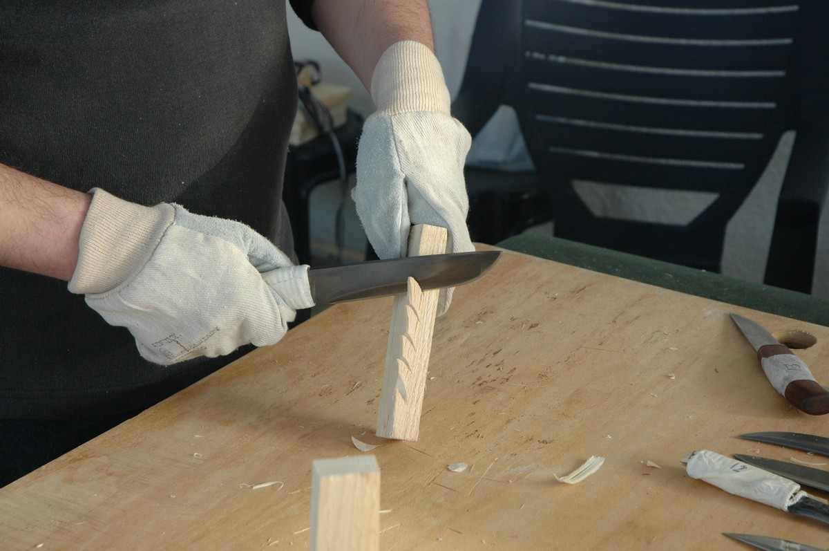 Мы уже как-то настроились на то, что нож показал результаты, указанные выше. И посему к строганию подошли со всей ответственностью, учитывая опыт удержания этого ножа с такой узкой рукоятью. Дощечку он не расколол, но этого и следовало ожидать, учитывая слишком легкий клинок. Строгать вроде бы было удобно, контролировать можно легко процесс, но, увы, нож строгал крайне неохотно. Стружку снимал с трудом, отщипывая щепу небольшими кусочками. И стал вязнуть в дереве после нескольких движений. Построгав еще немного для проформы, мы прекратили, поставив 2 балла.