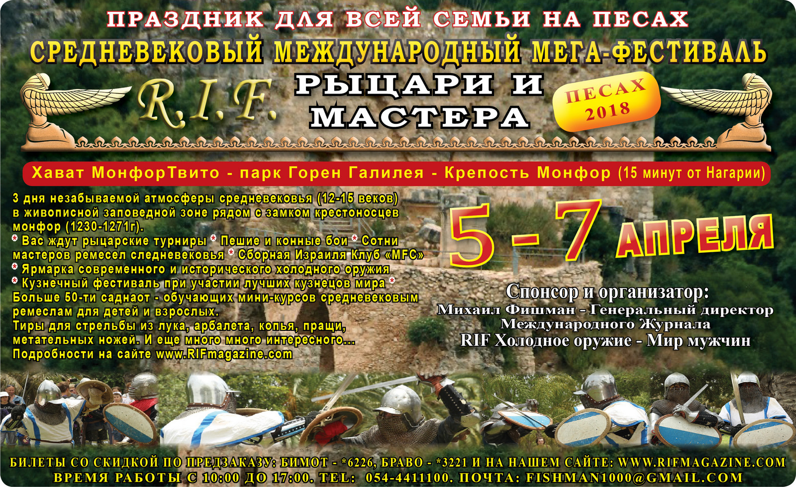* Вас ждут рыцарские турниры * Пешие и конные бои * Сотни мастеров ремесел следневековья * Сборная Израиля Клуб «MFC»