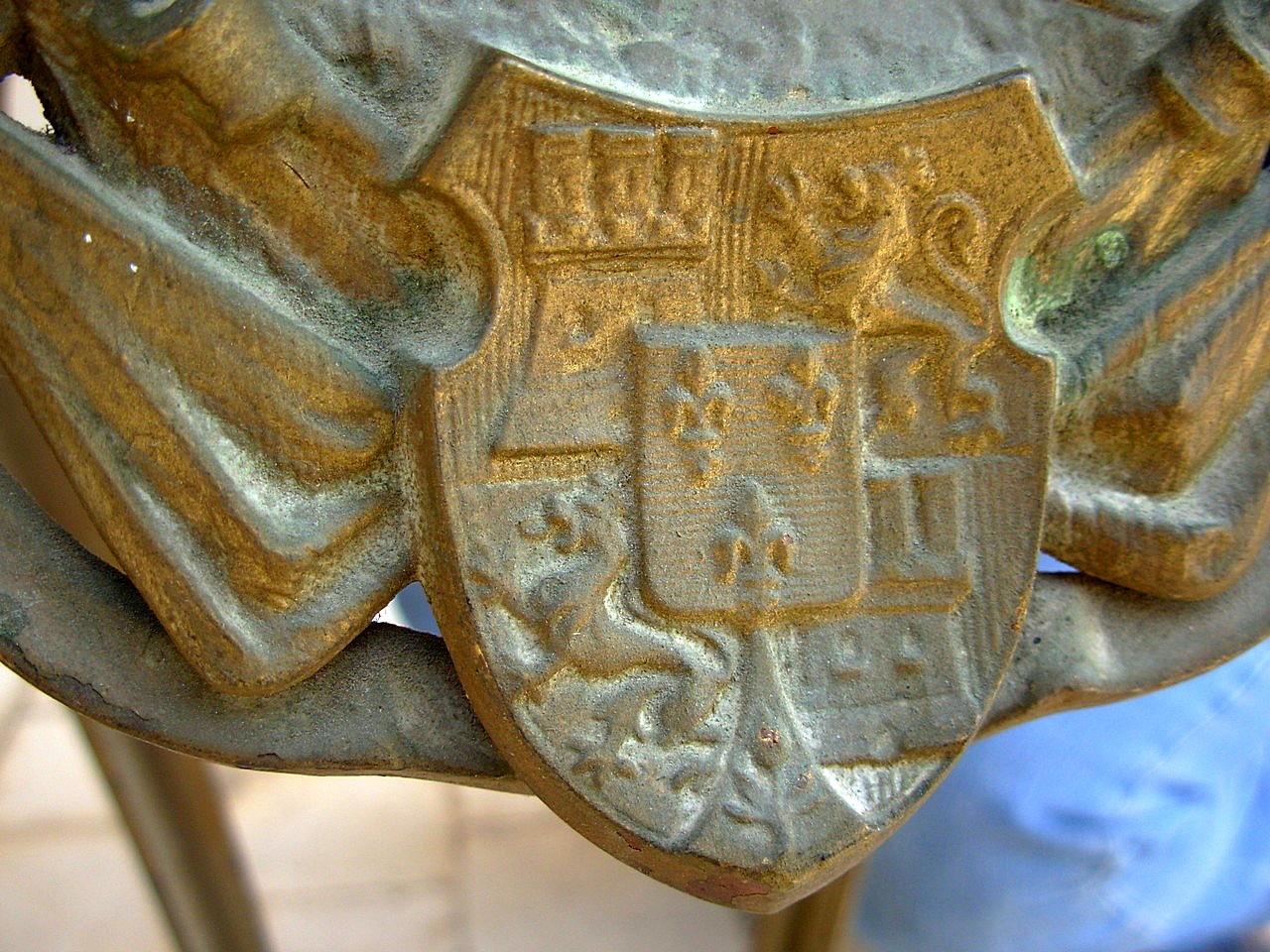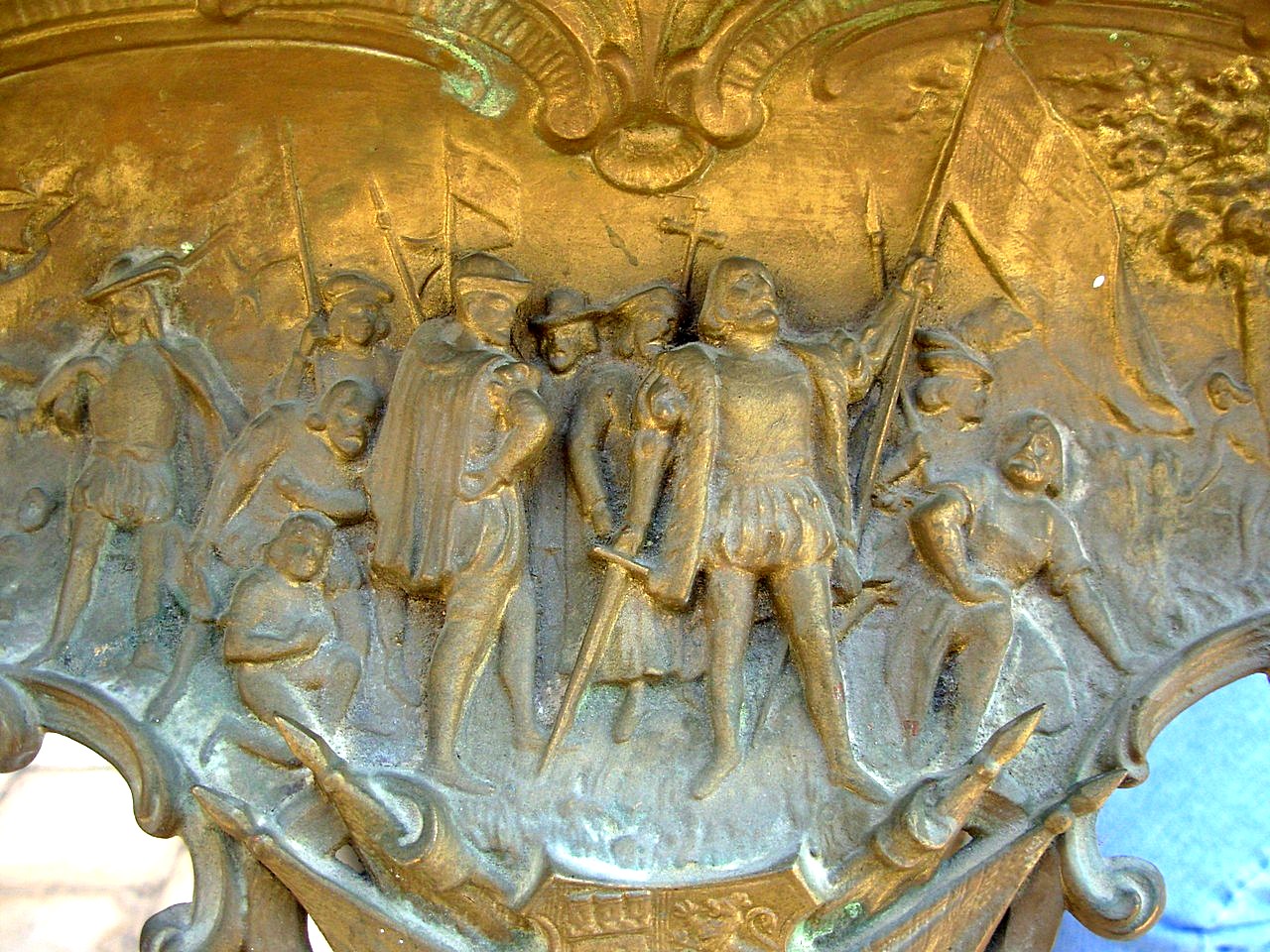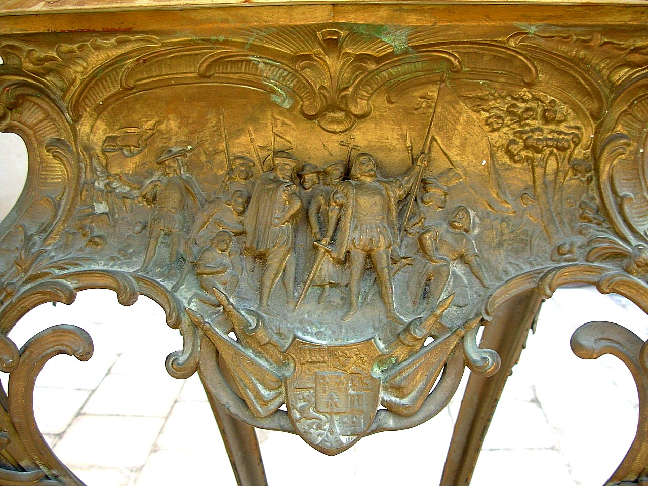 Вот здесь мы видим символы королевского дома Испании. Далее сделано изображение Колумба, когда он сходил на побережье Багамских островов вместе со своей командой, для пополнения запасов воды и пищи. Видим индейцев, встречающих Колумба и смотрящих на него как на божество из моря. До этого индейцы почти не видели европейцев, с их белой кожей и диковинной одеждой…