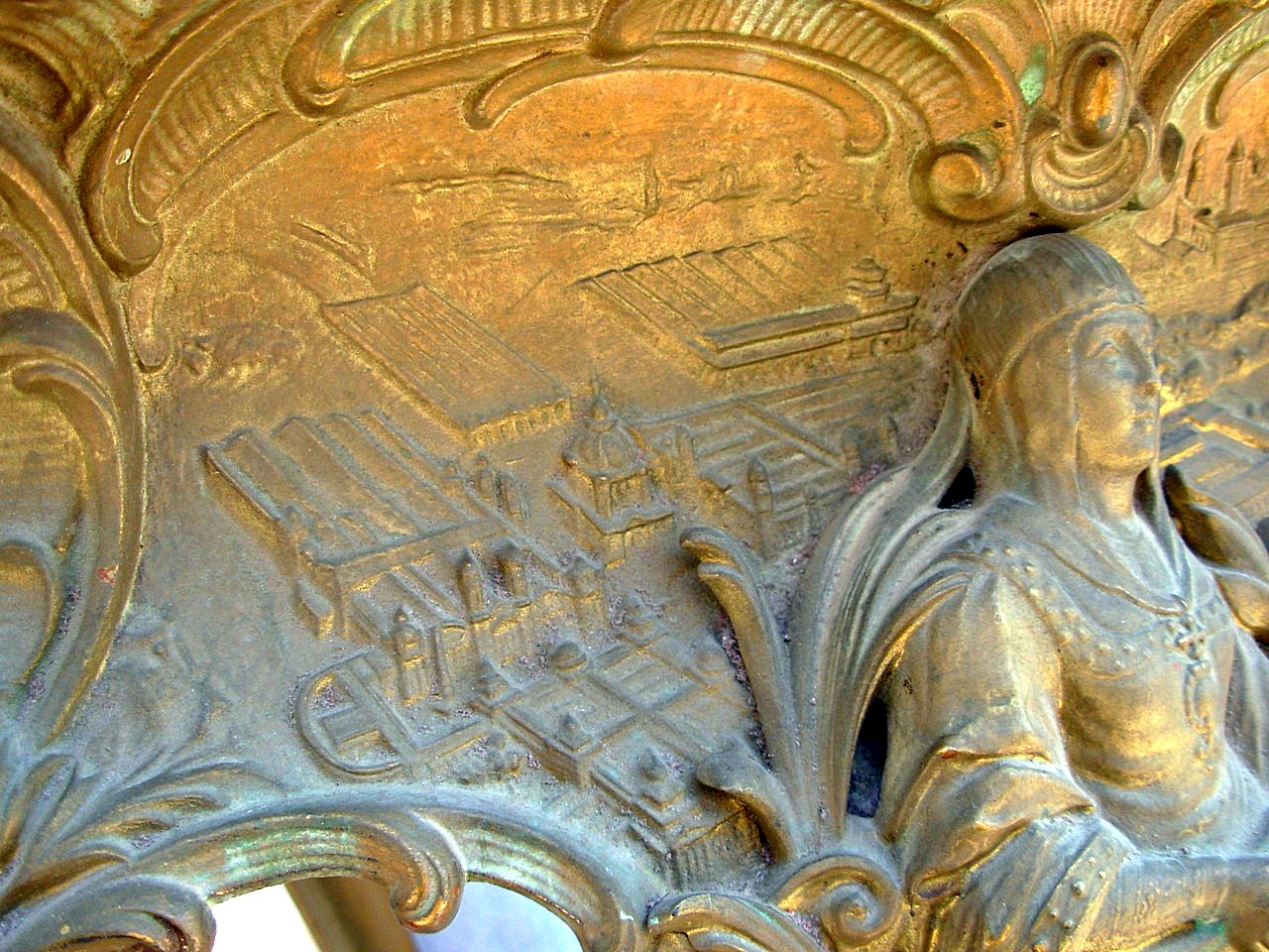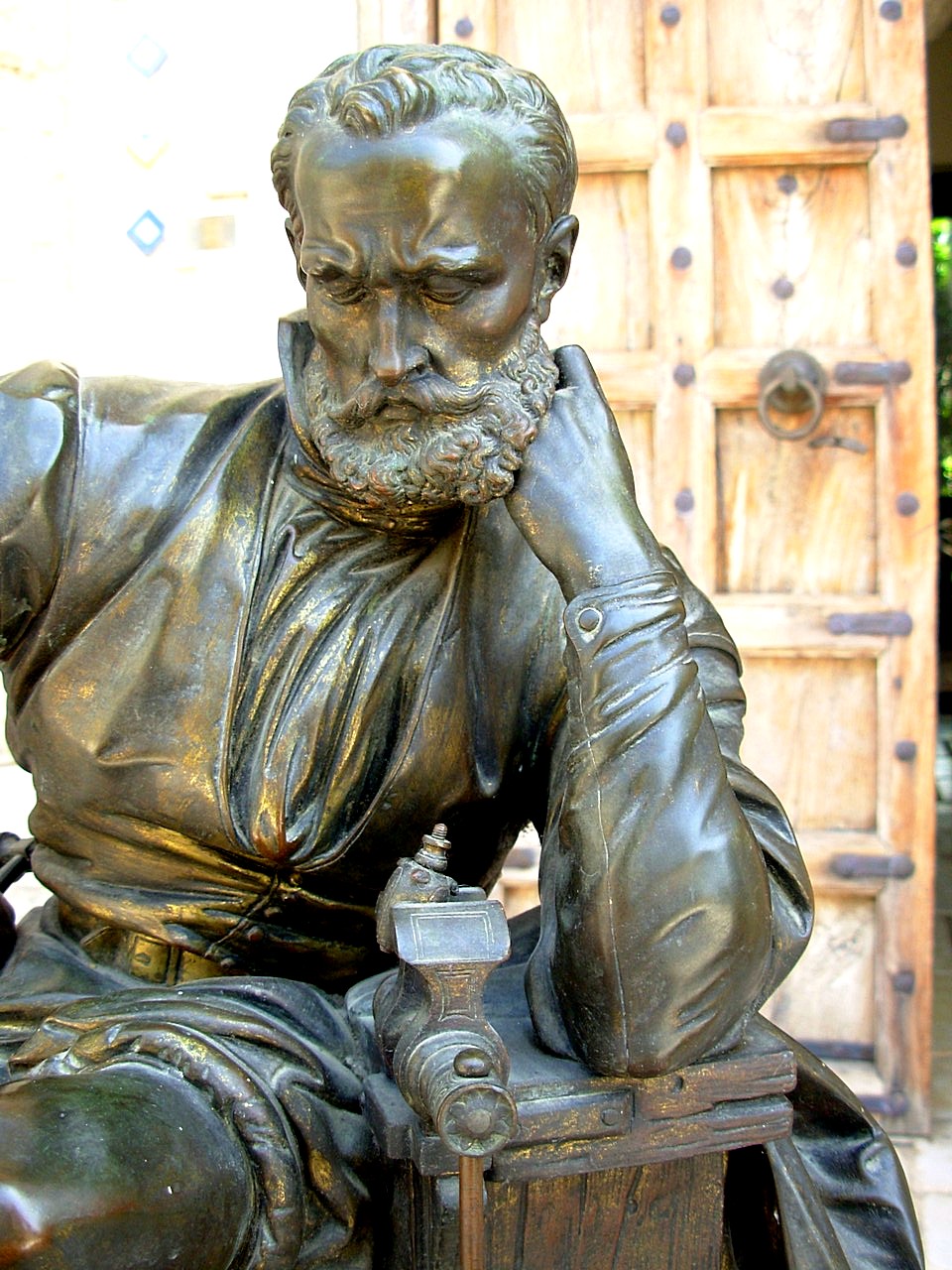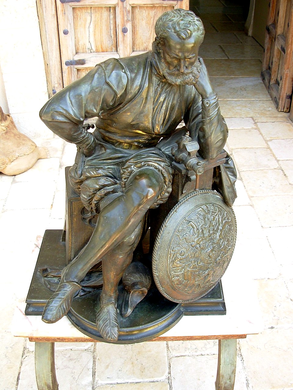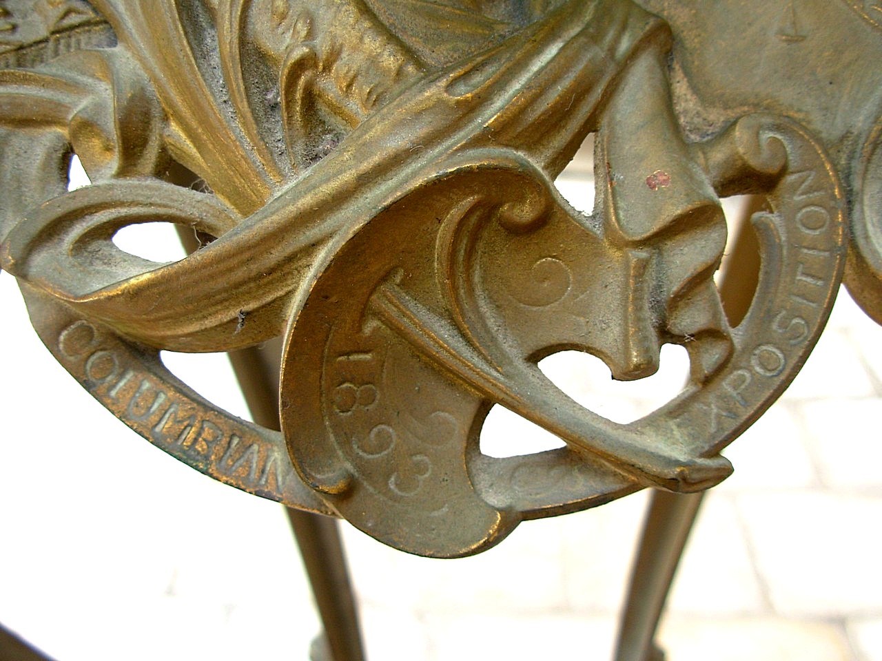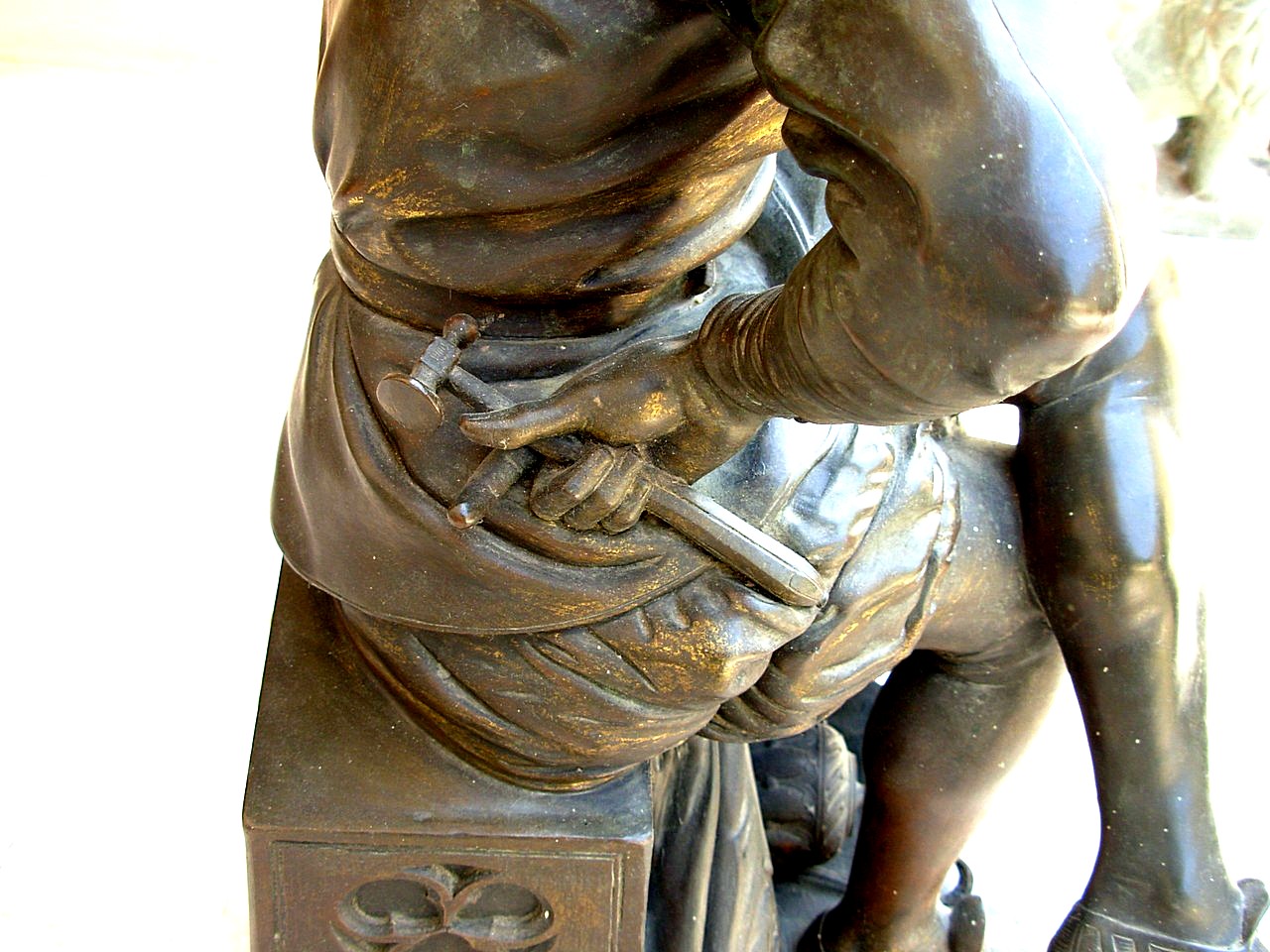 Однажды мне попалась небольшая скульптура, побывавшая на выставке. Как выяснилось, представляла ее французская сторона. Об этой скульптуре известно только то, что делал ее французский скульптор, но никто не знает его имени. Нет надписей на самой статуэтке, которые могли бы идентифицировать автора. Известно так же, что изготовлена скульптура была в 1850 году и была покрыта золотым напылением. Вот, смотрите, еще можно увидеть остатки золотого слоя на бронзе… Сама скульптура имеет в высоту 60 см. и весит около 30 кг. Но доподлинно известно, что она изготовлена во Франции. Называется композиция «Серебряных дел мастер» и посвящена реальному мастеру-ювелиру. Сидящий человек, задумчиво подперший рукой щеку, с молотком для чеканки в руках. Будто обдумывает новую работу. Присмотритесь, на сколько точно выполненные мелкие детали: одежда, модная в 15-16 столетиях, волосы, на лице видно каждую черточку, масляная чаша с носиком у ног мастера... Такая точность может говорить только о высочайшем мастерстве скульптора, создавшего композицию. И это всего лишь одна из многочисленных скульптур Чикагской выставки, представленных французами.