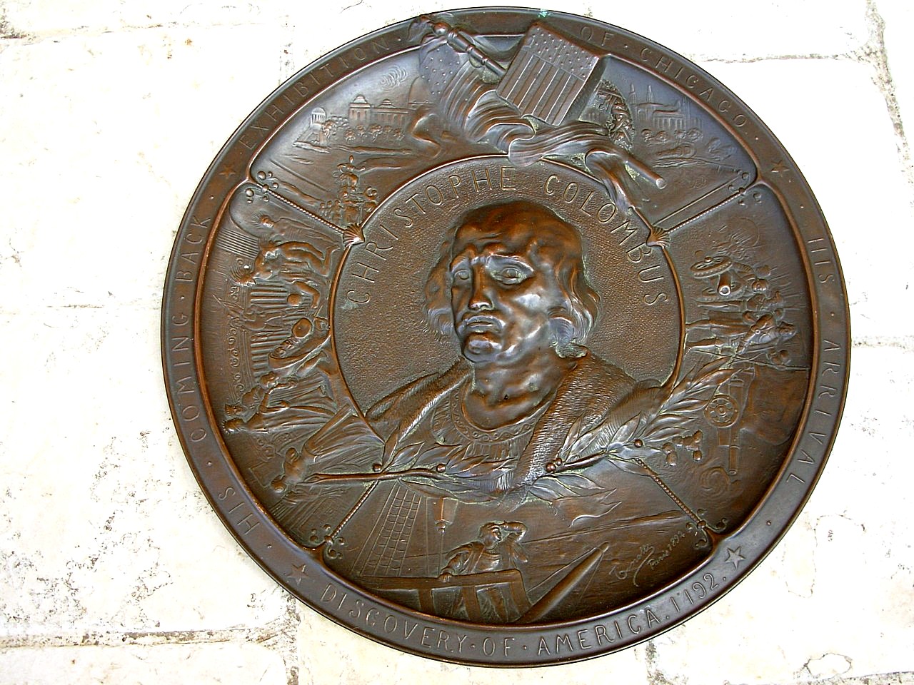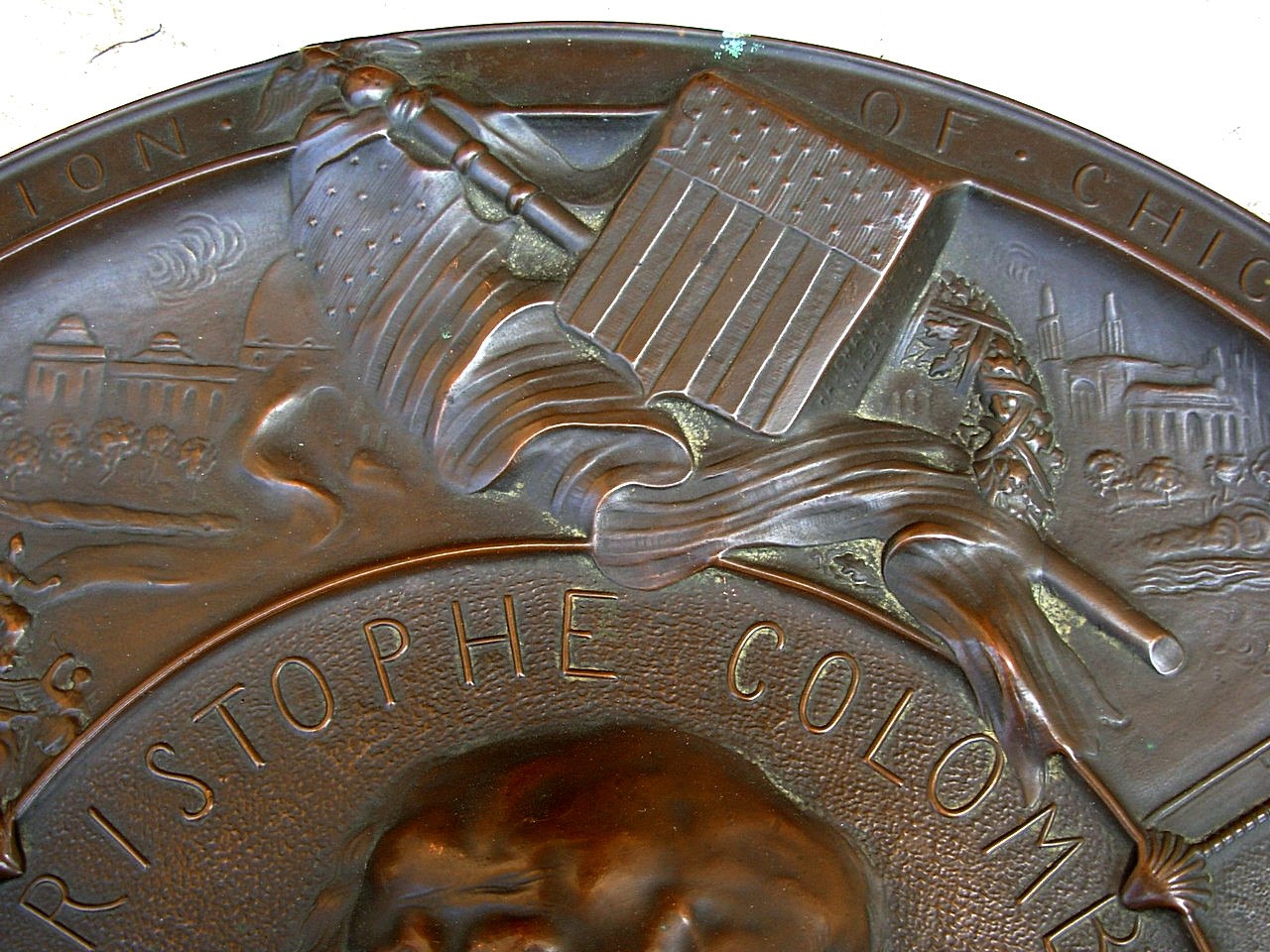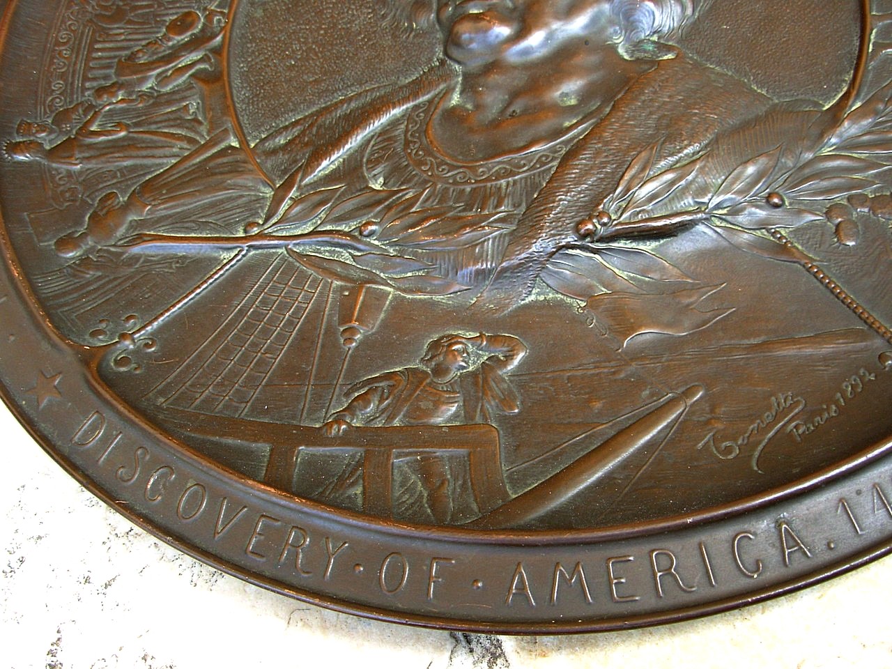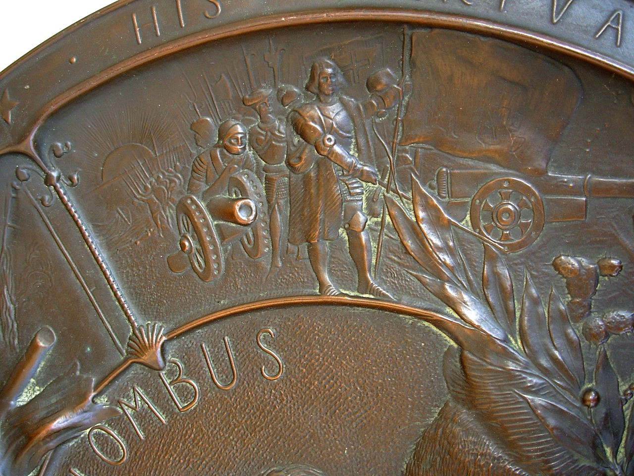 Давайте продолжим. Вот бронзовая тарелка, о которой мы говорили чуть раньше, изготовленная специально для экспозиции французским скульптором в 1892 году. Сверху по кругу идет надпись: «His coming back», снизу - «Discovery of America, 1492». По бокам идут надписи «His arrival» «Exhibition of Chicago». Короче говоря, все изображенное на тарелке, вновь рассказывает о прибытии Колумба на американский материк…