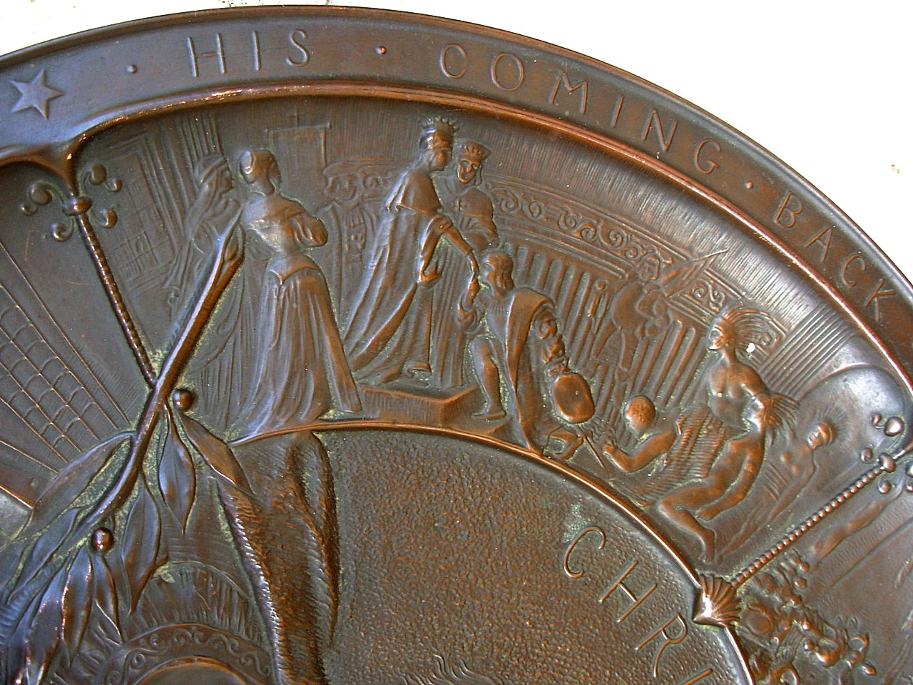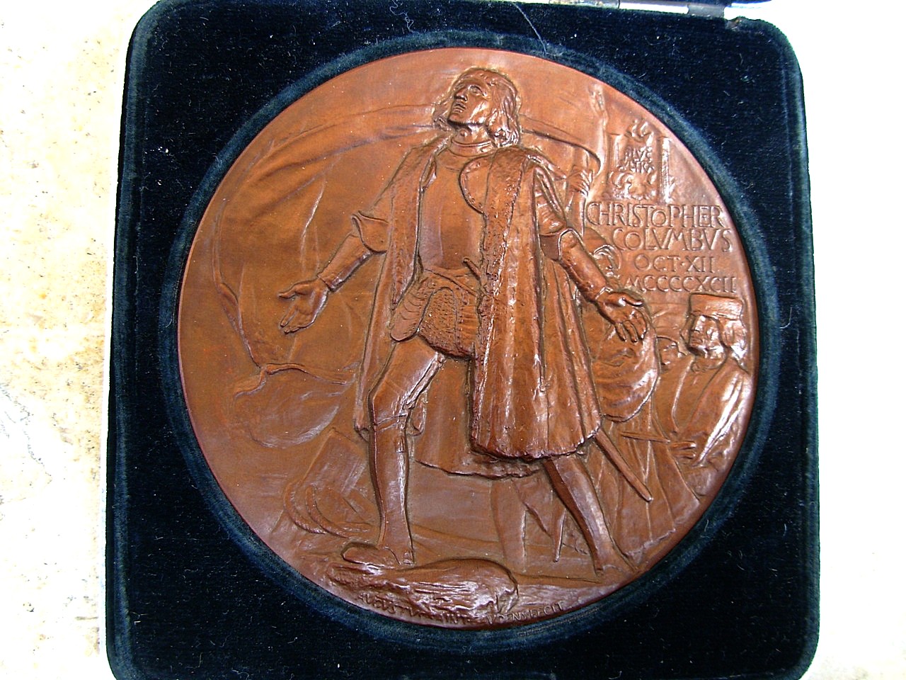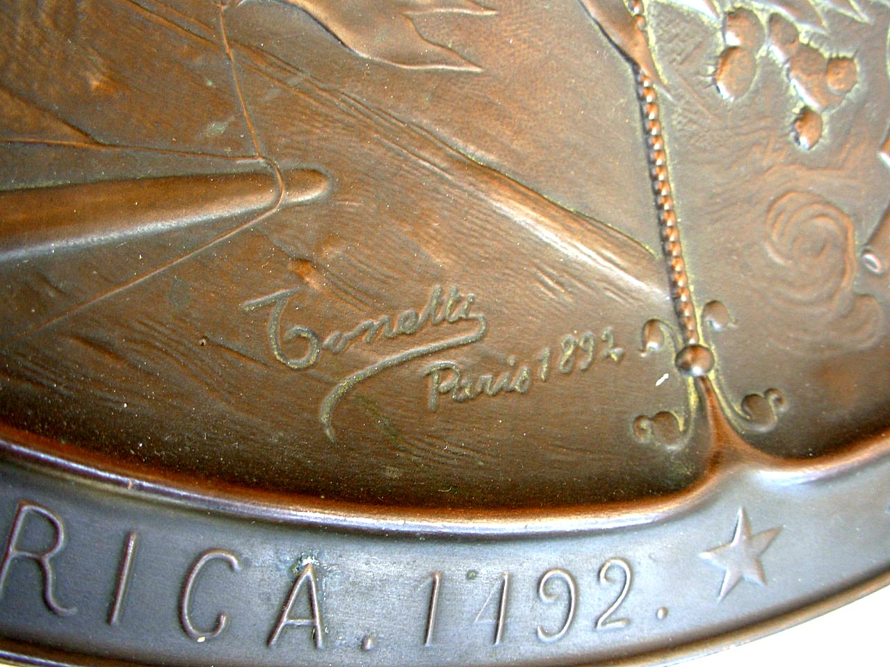 Давайте продолжим. Вот бронзовая тарелка, о которой мы говорили чуть раньше, изготовленная специально для экспозиции французским скульптором в 1892 году. Сверху по кругу идет надпись: «His coming back», снизу - «Discovery of America, 1492». По бокам идут надписи «His arrival» «Exhibition of Chicago». Короче говоря, все изображенное на тарелке, вновь рассказывает о прибытии Колумба на американский материк…