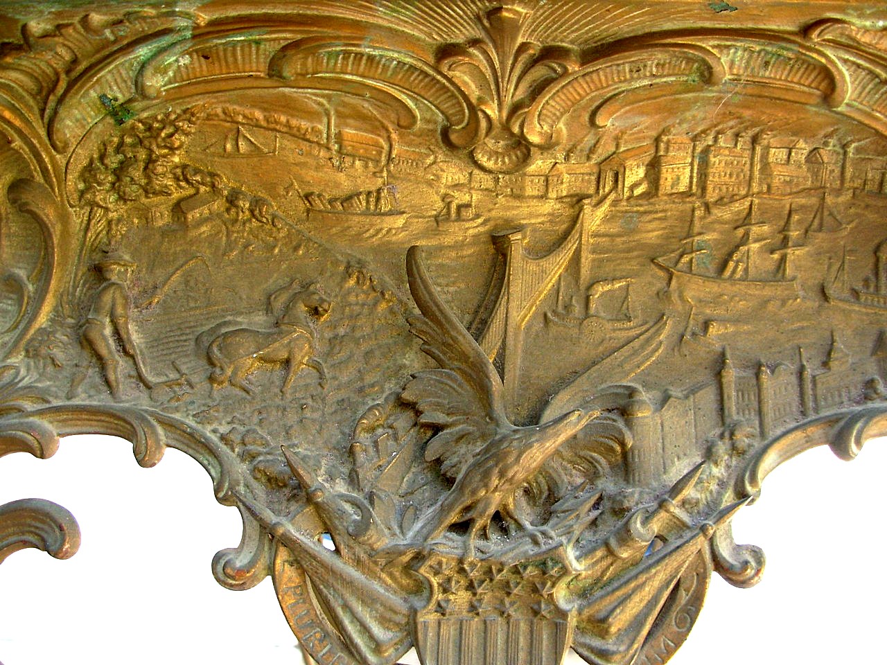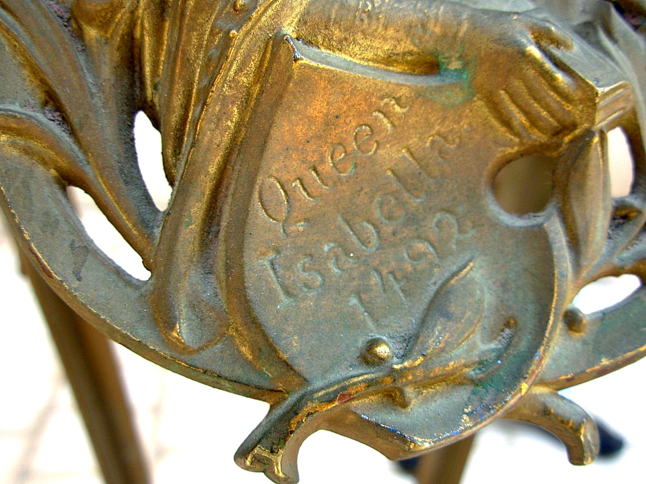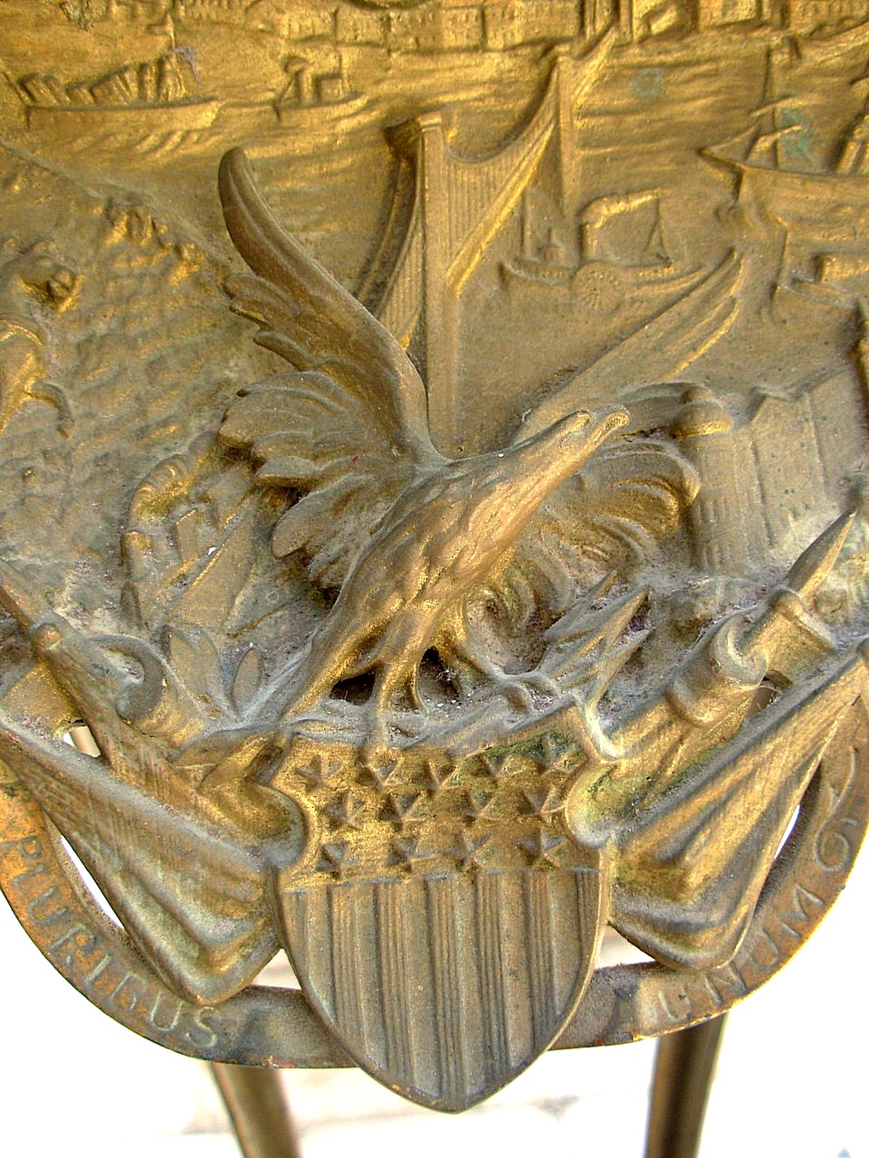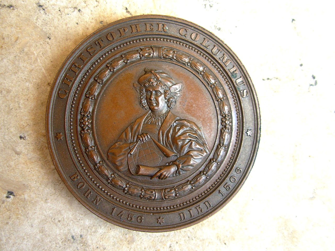 Давайте продолжим. Вот бронзовая тарелка, о которой мы говорили чуть раньше, изготовленная специально для экспозиции французским скульптором в 1892 году. Сверху по кругу идет надпись: «His coming back», снизу - «Discovery of America, 1492». По бокам идут надписи «His arrival» «Exhibition of Chicago». Короче говоря, все изображенное на тарелке, вновь рассказывает о прибытии Колумба на американский материк…