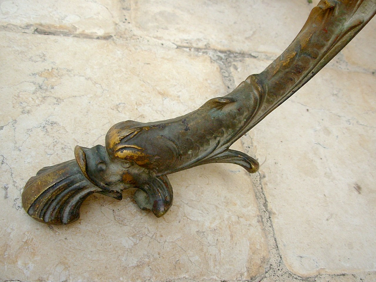 Ножки стола выполнены в виде дельфинов, посмотрите. Хочу напомнить еще раз, что стол был отлит целиком, а не по частям, что говорит о его уникальности в плане создания, как произведения искусства. Можно сказать, что он – фактически скульптура. Кстати, для экспозиции было отлито еще очень много скульптур, и к ним мы перейдем чуть позже…