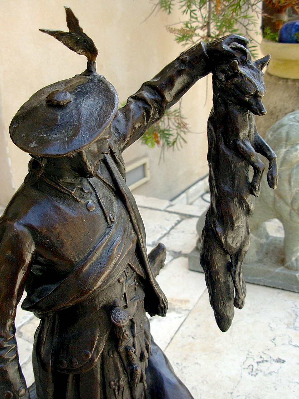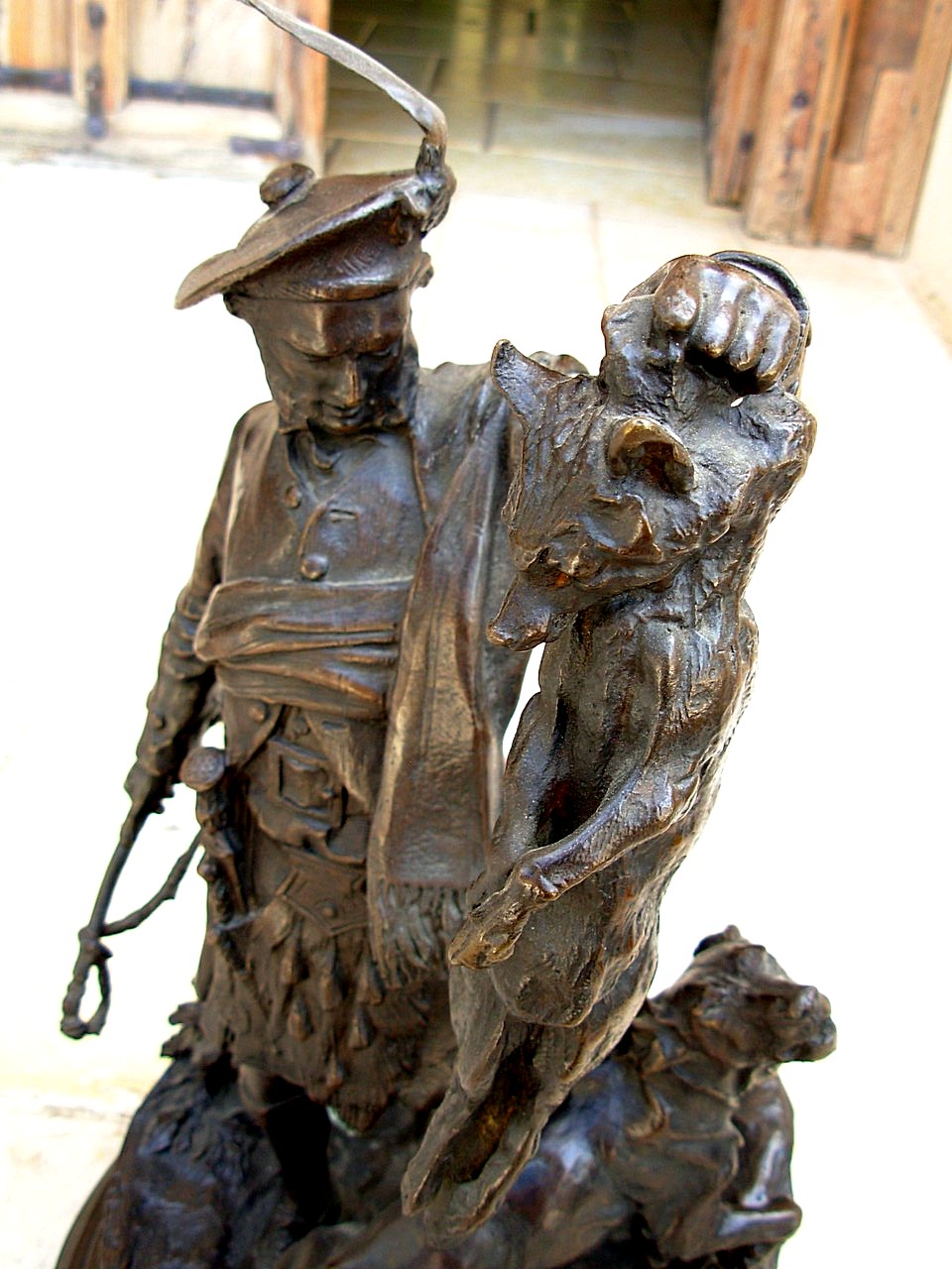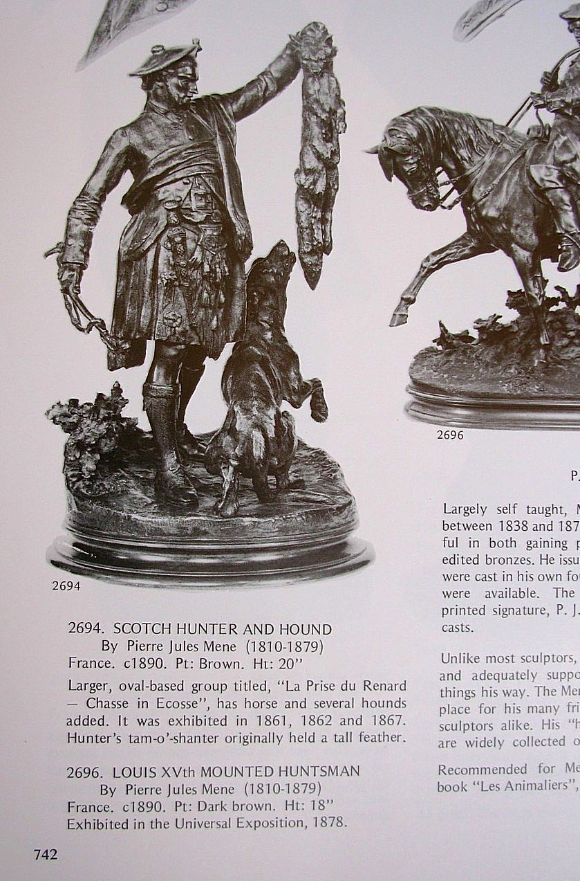 Есть, кстати, вот такая скульптура, которая называется «Шотландский охотник и лис», выполненная в бронзе. Ее автор – француз Пьер Жюль Мене, умерший задолго до выставки, и описание его работы есть в каталоге бронзовых изделий Европы. Изготовленная примерно в 1860 году, скульптура имеет в высоту около 50 см и вес около 25 кг. Сама композиция, как мы видим, изображает богатого шотландского охотника, держащего на вытянутой руке только что убитого им лиса. У ног – собака, все еще не успокоившаяся в пылу охоты. И опять, смотрите, как тщательно выполнены все детали: одежда охотника, шерсть собаки и лиса, даже национальный шотландский нож выполнен с особым старанием… Вот еще, кстати, в этой же книге, есть фотография работы того же скульптора, изображающего Луи XV на охоте, изготовленная примерно в 1870, и так же в свое время представленная на Чикагской выставке…