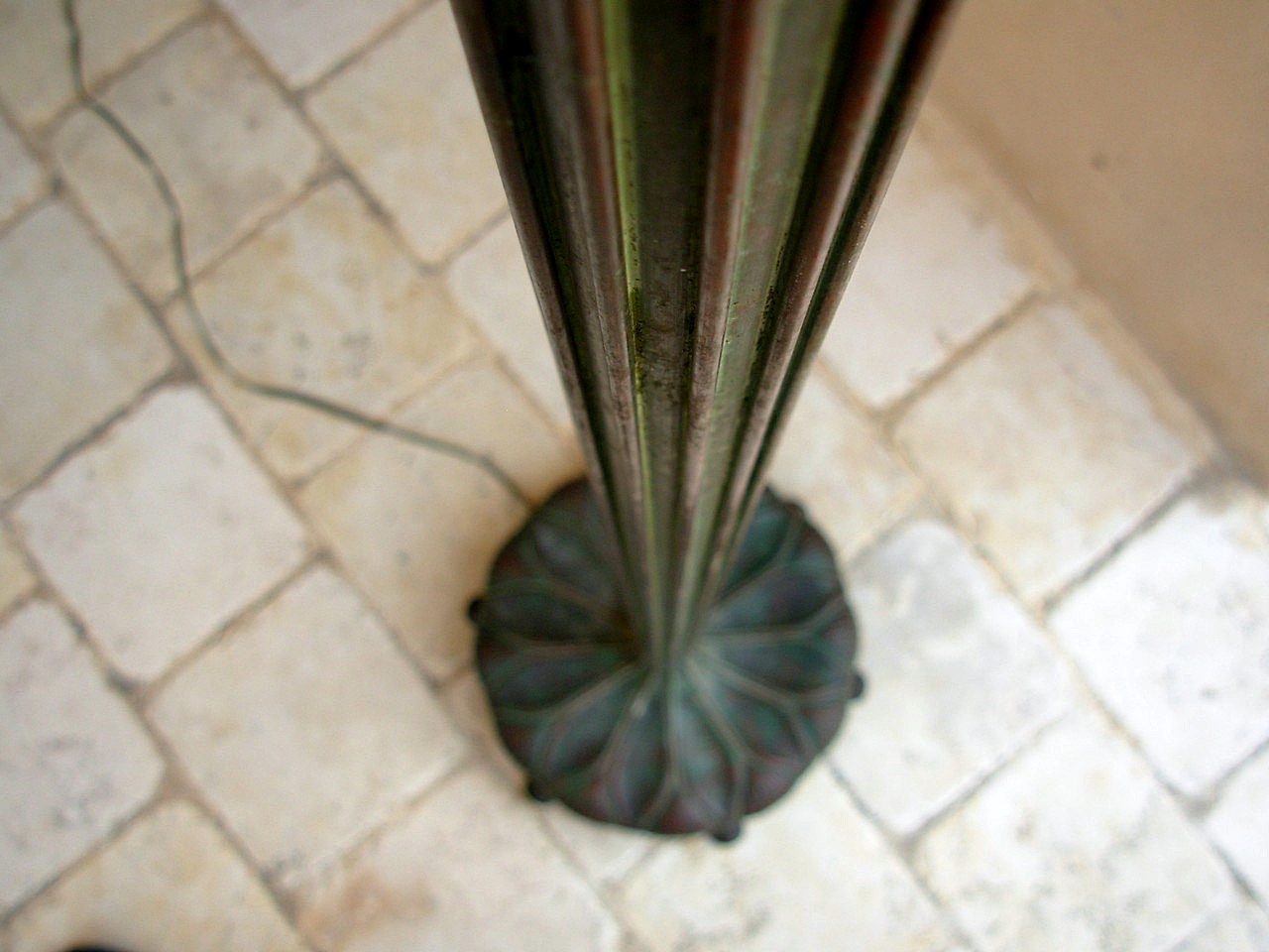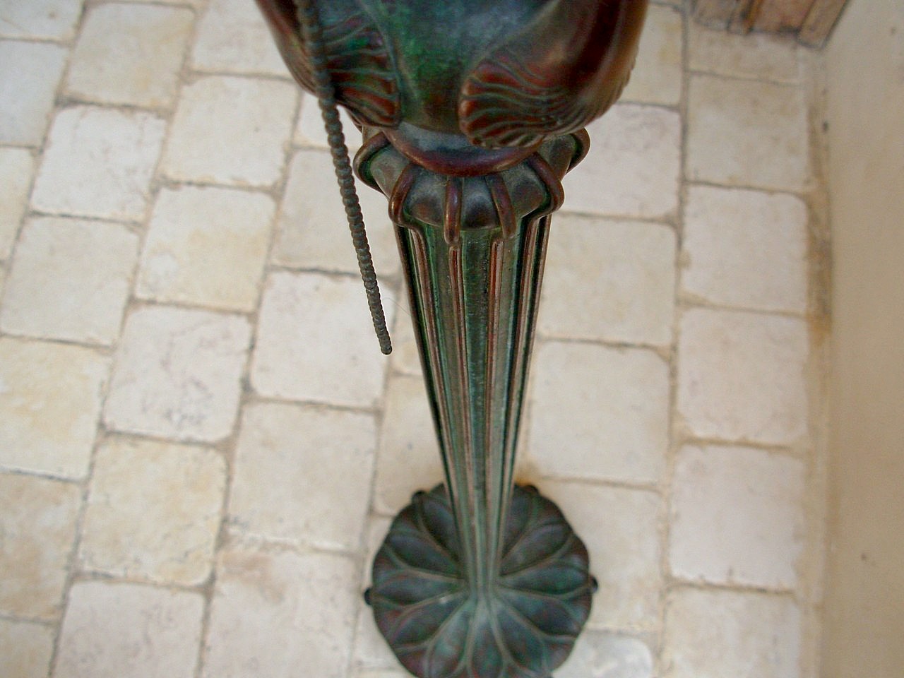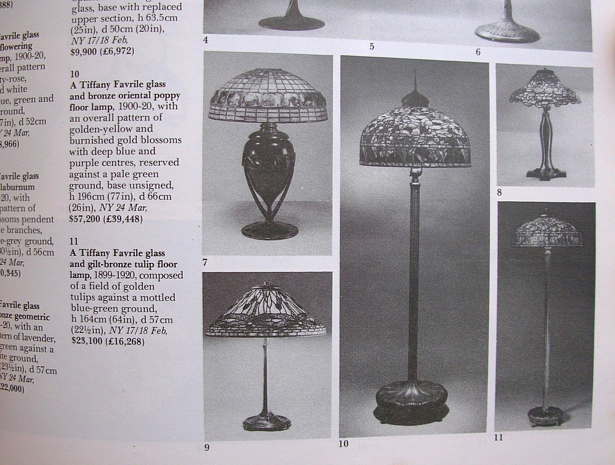 - Это один самых занимательных предметов той эпохи. Бронзовый торшер, изготовленный мастерской салона Тиффани в 1890 г. И представленный так же на выставке. К сожалению, он без абажура. Можете глянуть, вот книга, изданная Сотбис, в которой указано, что такие торшеры в 1986 ушли с аукциона по ценам от 25 до 55 тысяч долларов. Но торшер уникален, в первую, очередь, тем, что фактически сделан вручную и со всей тщательностью, целиком из бронзы. Его высота примерно 196 см.