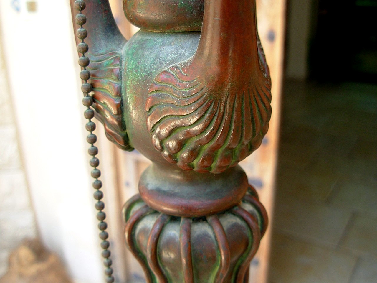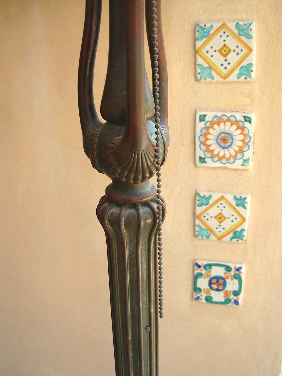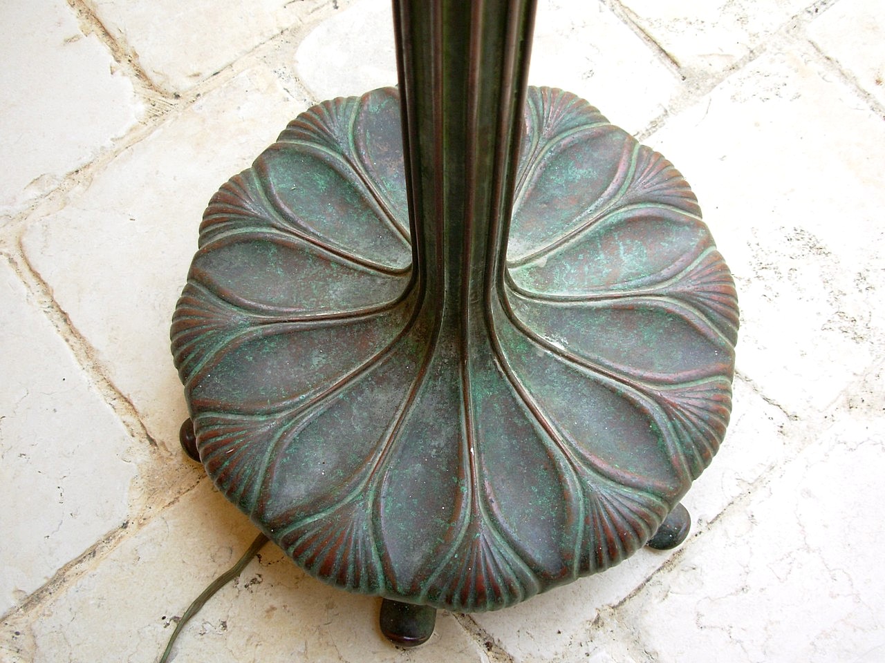 - Это один самых занимательных предметов той эпохи. Бронзовый торшер, изготовленный мастерской салона Тиффани в 1890 г. И представленный так же на выставке. К сожалению, он без абажура. Можете глянуть, вот книга, изданная Сотбис, в которой указано, что такие торшеры в 1986 ушли с аукциона по ценам от 25 до 55 тысяч долларов. Но торшер уникален, в первую, очередь, тем, что фактически сделан вручную и со всей тщательностью, целиком из бронзы. Его высота примерно 196 см.