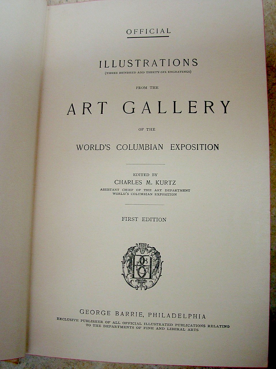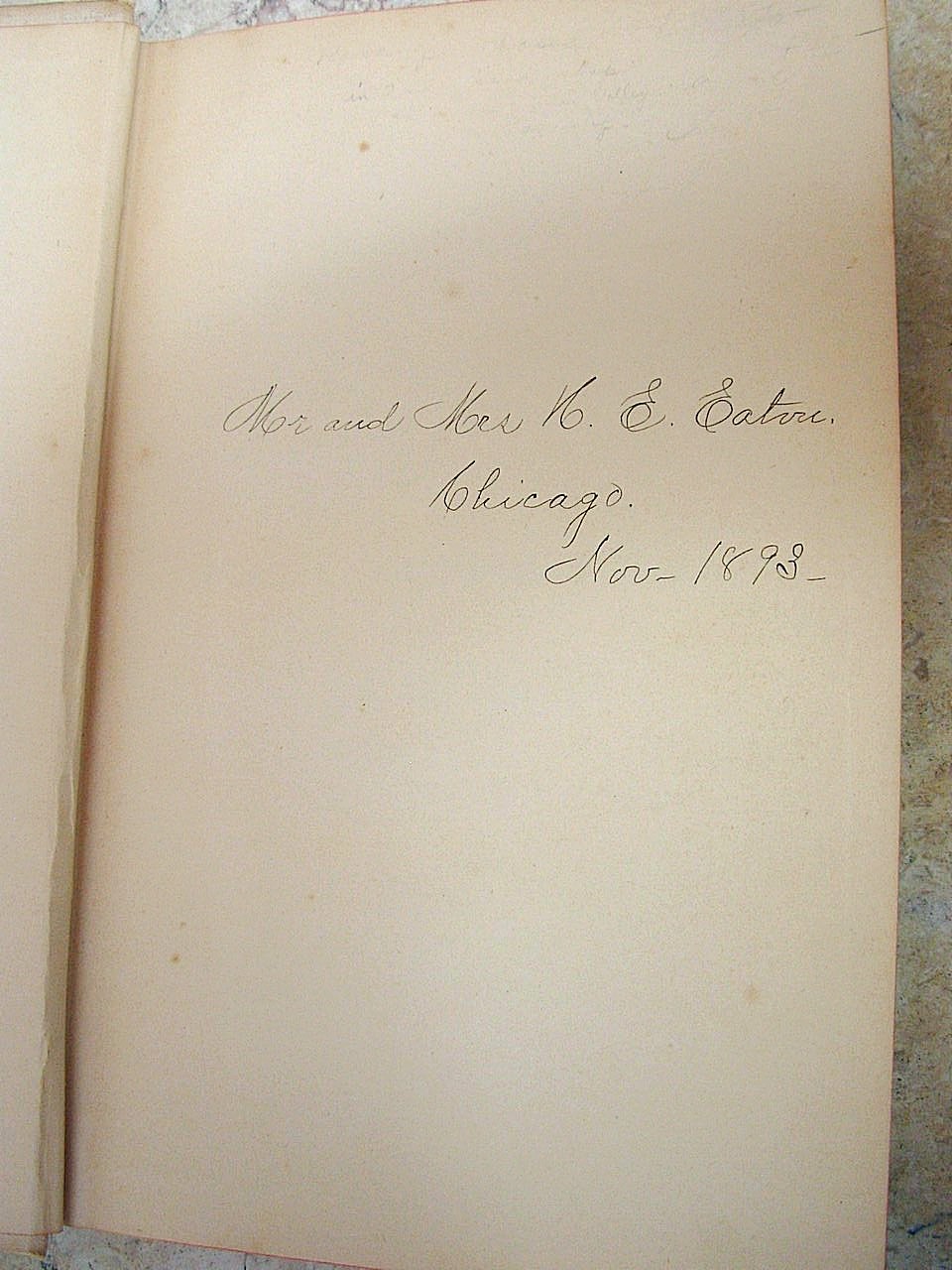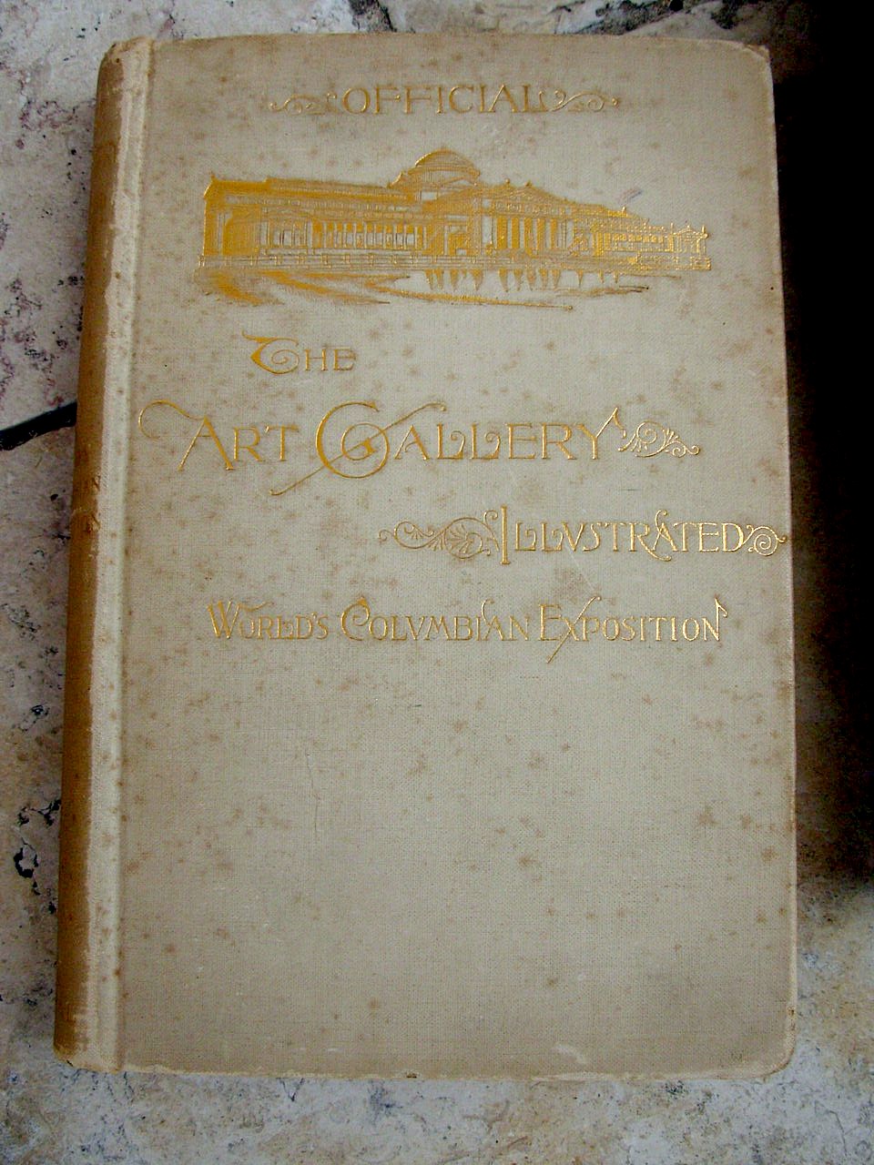Вот интересная книга. Подписана кому-то в ноябре 1893 года, видимо, в память о выставке «Мистеру и миссис Итон, Чикаго, ноябрь 1893». Если, конечно, я правильно прочел фамилию. Посмотрите, в самой книге есть фотографии, показывающие картины выставки, фотографии и произведения искусства, которые размещались на стенах для всеобщего обозрения. Выставлялись работы молодых и талантливых художников со всего света, некоторые картины писались специально для этой выставки...