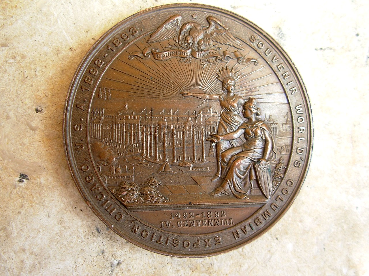 А вот другая памятная медаль. С одной стороны – Кристофор Колумб и дата его рождения и смерти, 1456-1506 гг. С другой – надпись по кругу «Souvenir World’s Columbian exposition, Chicago, U.S.A., 1892-1893.». Уже привычное нам изображение выставки, американский орел, держащий ленту с надписью «Наша сила – в единстве».