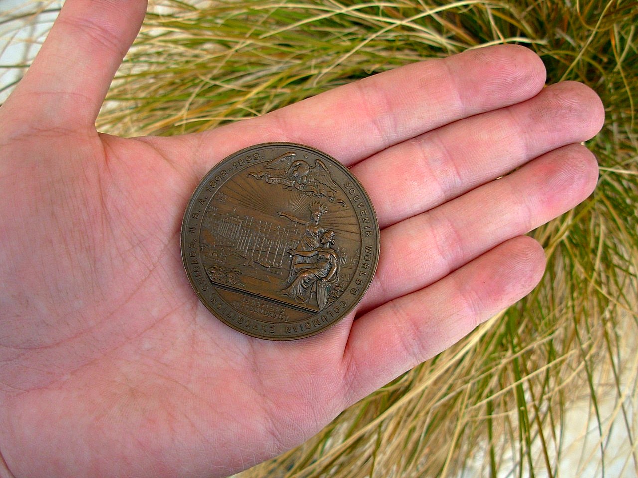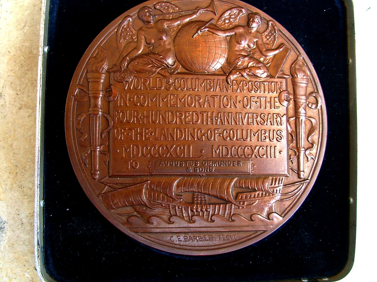 Перейдем к памятным медалям, которые дарили участникам выставки. Вот, например, медаль с надписью «World Columbian exposition in commemoration of the four hundredth anniversary of the landing of Columbus * MDCCCXCII * MDCCCXCIII *» и название компании, изготовившей медаль «Augustus gemunder & sons». Есть изображение символа выставки, а так же изображение Колумба, прибывшего на материк.