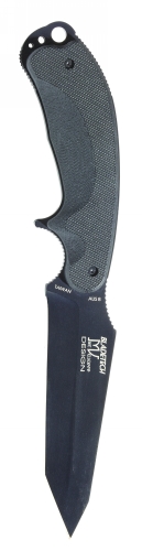Клинок изготовлен из японской коррозиестойкой стали AUS-8 с оксидным напылением, твердость 57-60 HRS. В местах непосредственного контакта с хвостовиком ножа сделаны насечки, для боле уверенного удержания ножа даже во влажных руках. Накладки рукоятки выполнены из искусственного рельефного материала G10. Общая длина ножа 224 мм, длина лезвия 108 мм.