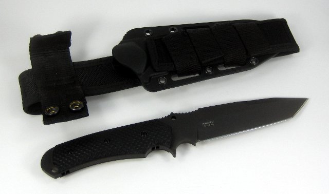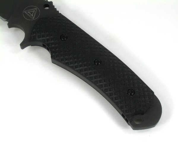 Рельефные накладки рукоятки выполнены из синтетического материала G10. В комплекте вместе с ножом поставляются ножны и крепление для них, которое позволяет закрепить ножны на ноге или руке. Ножны выполнены из термоформованного пластика Kydex и Cordura.