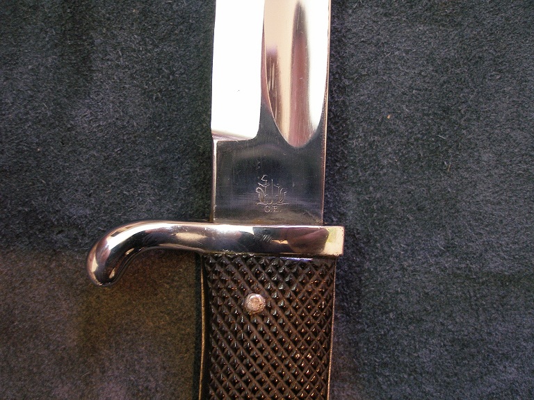 На продажу штык для ношения вне строя,так называемый парадник, KS 98 длинный ,производитель Карл Ейкхорн,Золинген. Клеймо -две белки сидящие спина к спине, применялось с 1906 по 1921.Если ошибаюсь и кто -то владеет более точной информацией по клейму-поправьте,буду только рад.Пластиковые накладки на ручке закреплены тремя заклепками.На внутренней поверхности кнопки есть сборочный номер.Состояние на фото,неплохое.Ножны хромированы ,для самого загадка- то ли это частный заказ военнослужащего страны союзника Германии.После ПМВ германская армия была популярна и моду на ношения вне строевых парадных штыков перенимали военнослужащие других стран.К примеру австрийский парадный манлихер имел хромированные ножны.Или другой вариант-чья-то реставрация для красоты.Цена 700 шек. тел 0542047471.