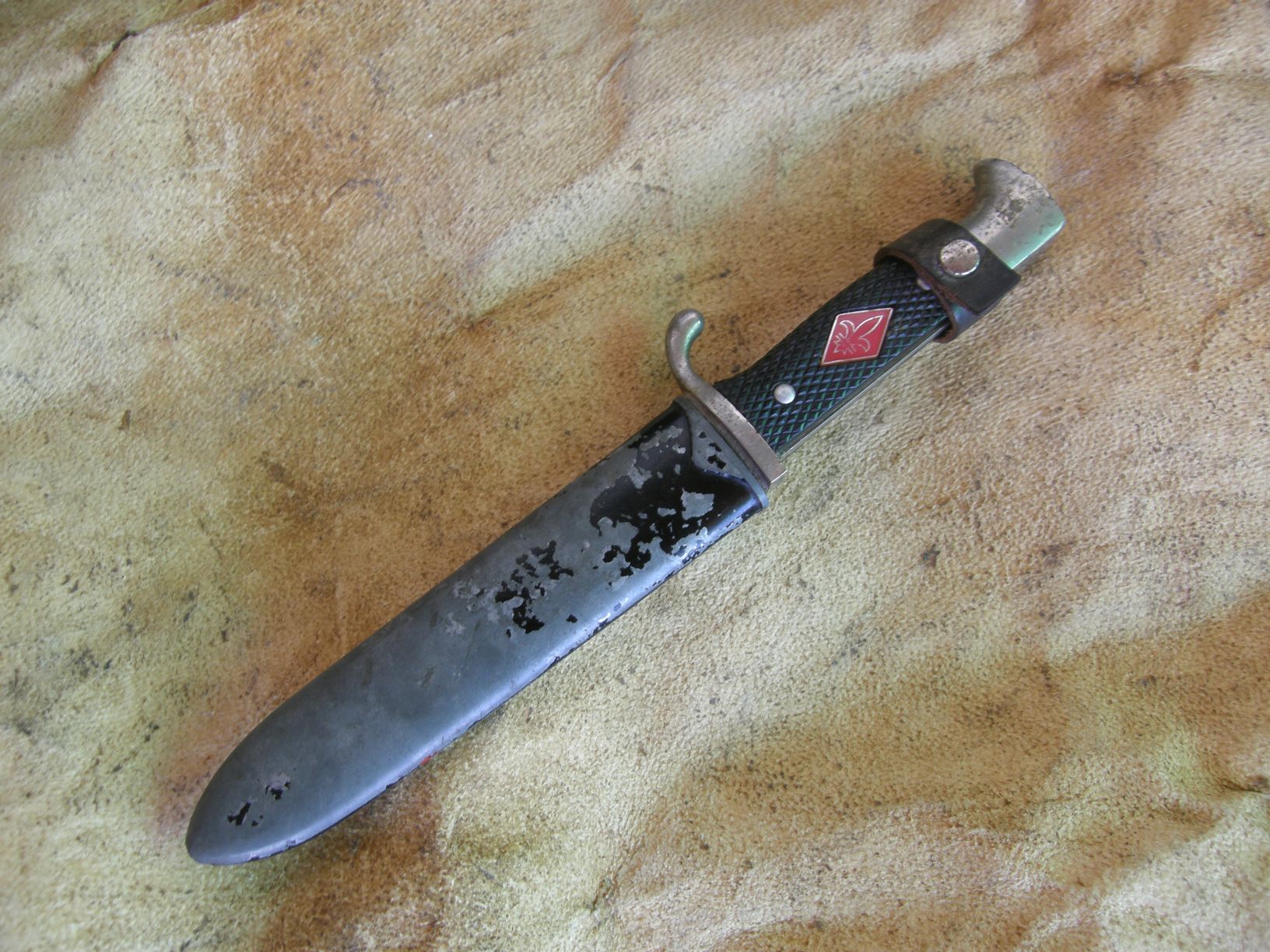 Нож скаутов ,германия .Нож был изготовлен на основе ножа для Гитлер юнгенд в послевоенное время. Единственным отличием является эмблема на накладках, вместо свастики ,международный символ движения скаутов ,лилия.