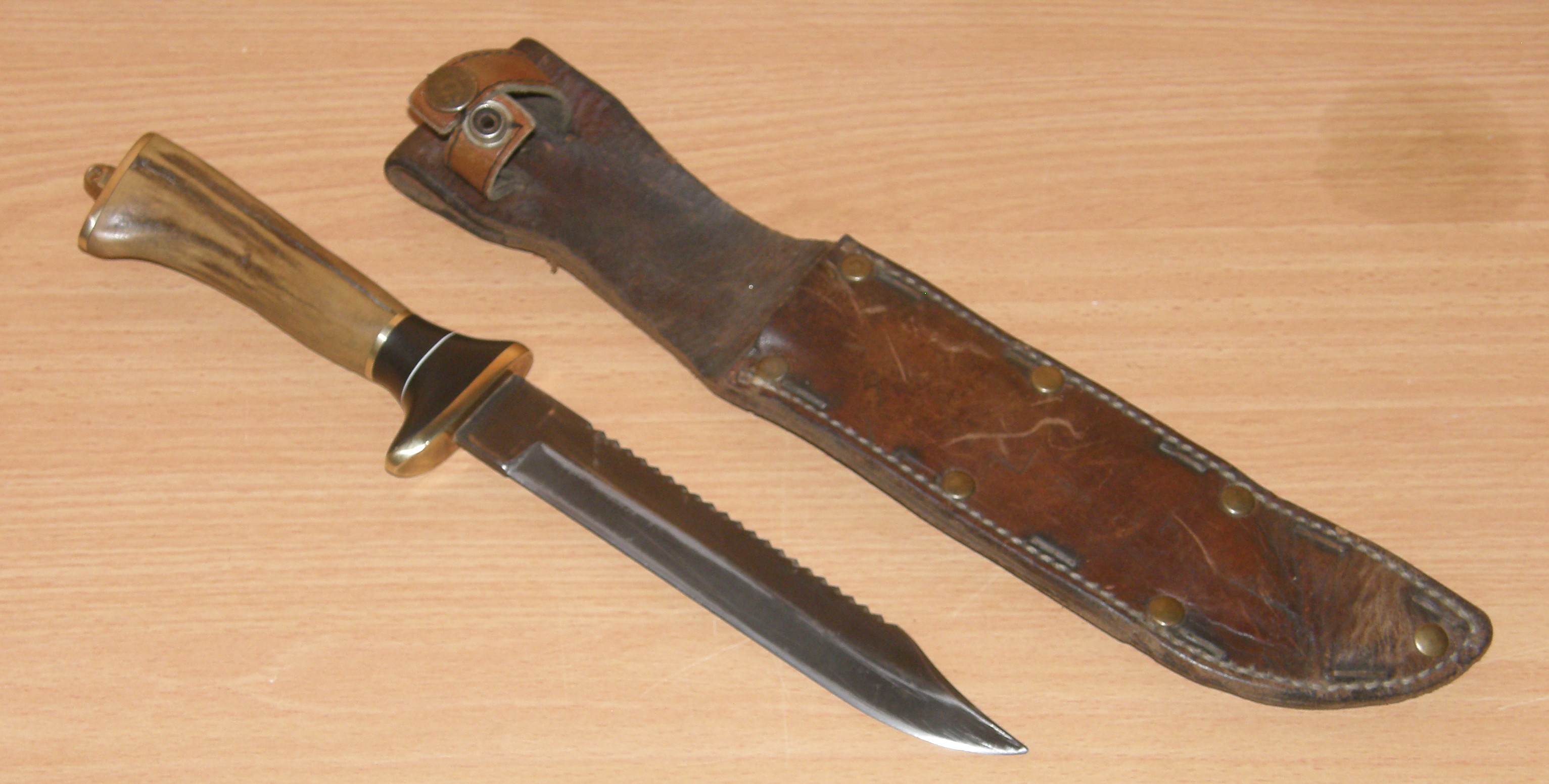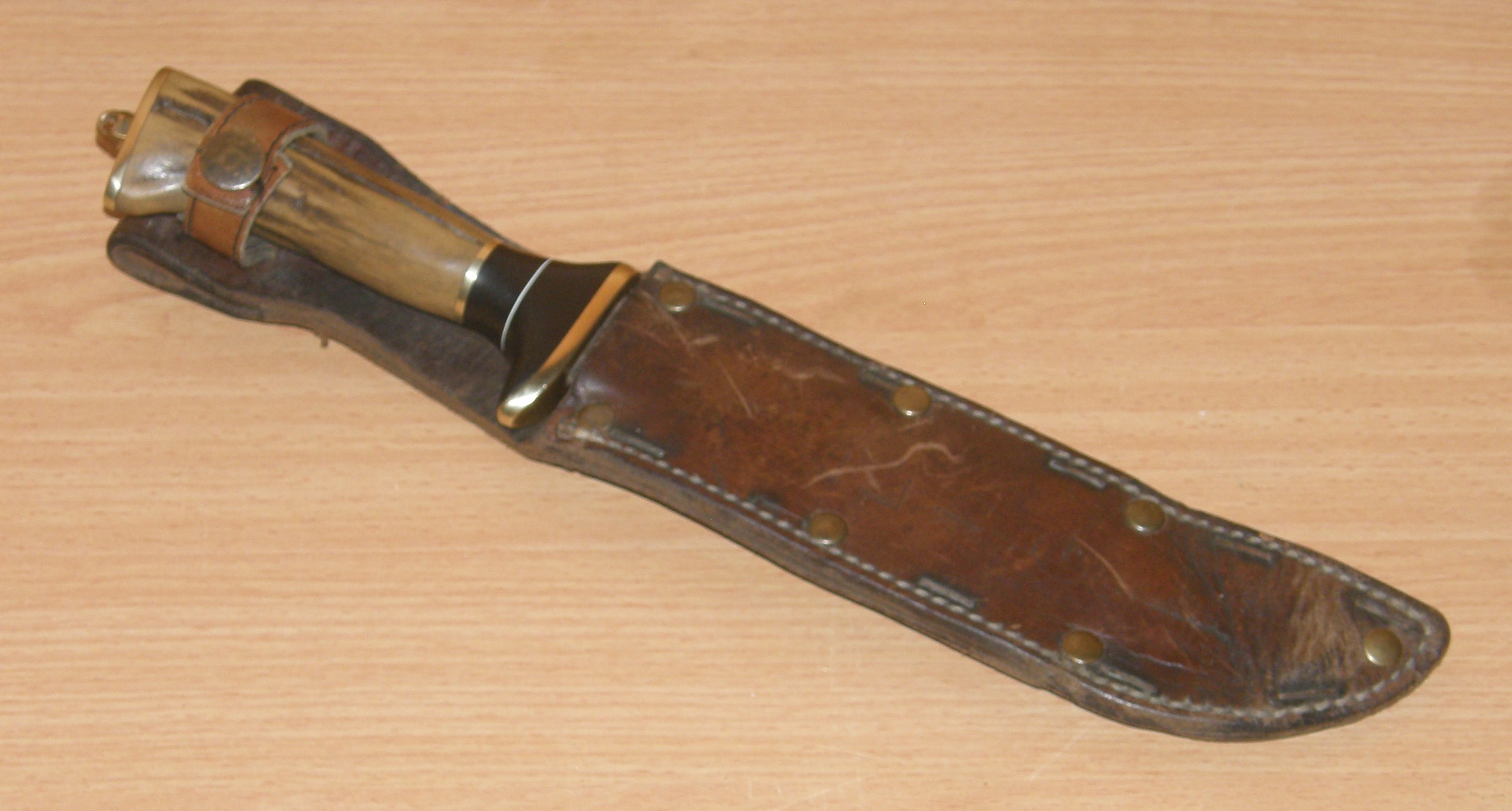Рукоять-старый рог лося, чёрный пластик, латунь.