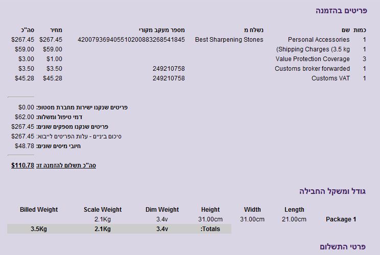 а это мой счет с шипито за 8 предметов .от продавцов до склада где-то ещё в общей сложности 70-80 дол.т е 8 предметов в израиль стоит где-то около 185 дол ну и конечно 16% маама нашему родному государству