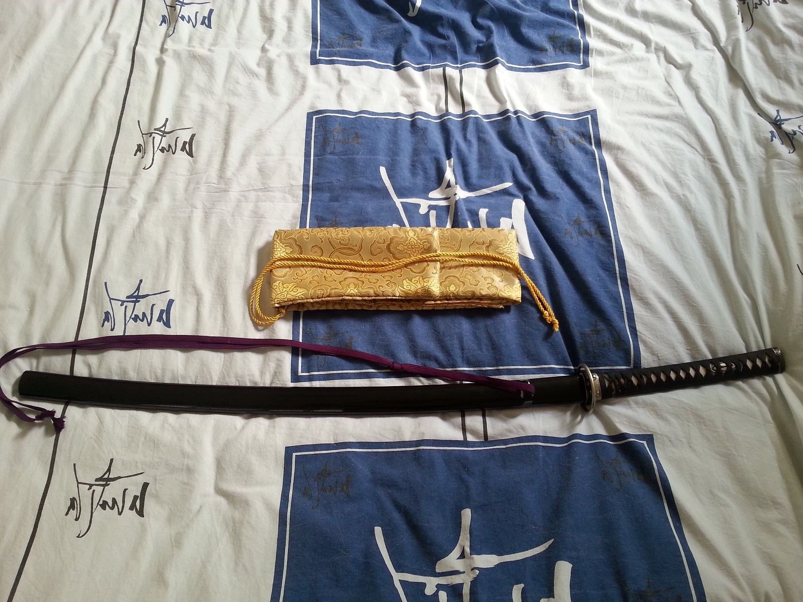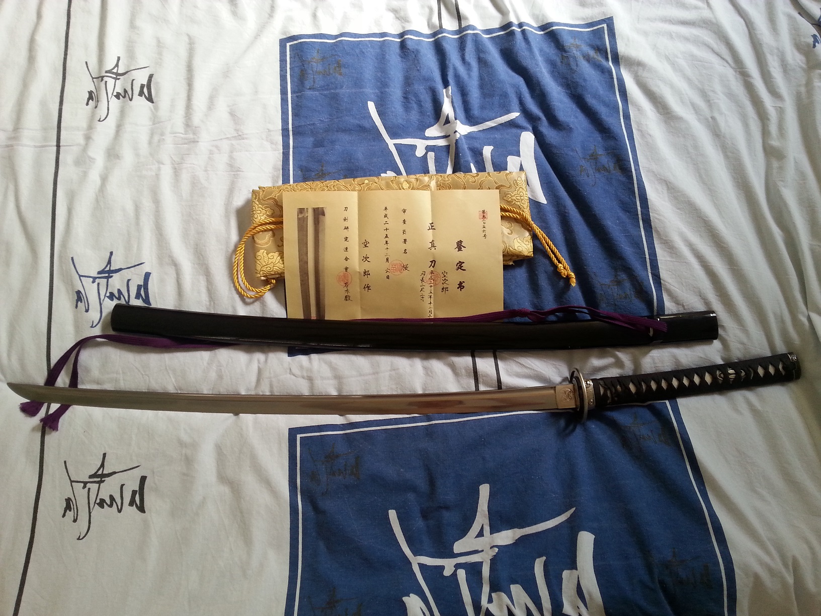 Продаю катану, работа Сасаки Коджиро, выполнена на заказ под мои пропорции (отличается от стандарта длиной клинка- 76 см от цубы), фурнитура- Домоэ (завитки), меч использовался в тренировках иайдзюцу в течении 8 лет, состояние отличное (есть,конечно, потёртости цука-ито и следы использования на клинке, для коллекции потребует полировки), точёная, подходит для тамесигири, хамон виден под определённым углом (не яркий, можно выявить полировкой). В комплекте- шёлковый чехол, сертификат аутентичности. Хвостовик подписан. Самовывоз из Хадеры. Цена- 5000 шекелей, торга не будет. 052 257 2827, Михаил.