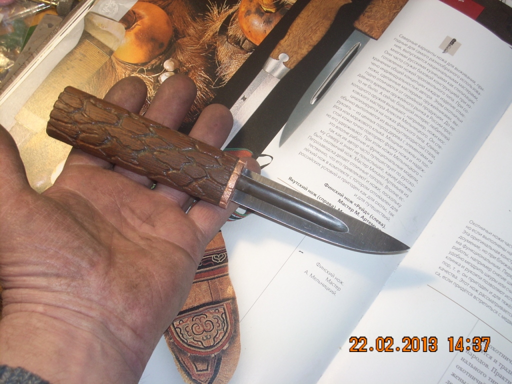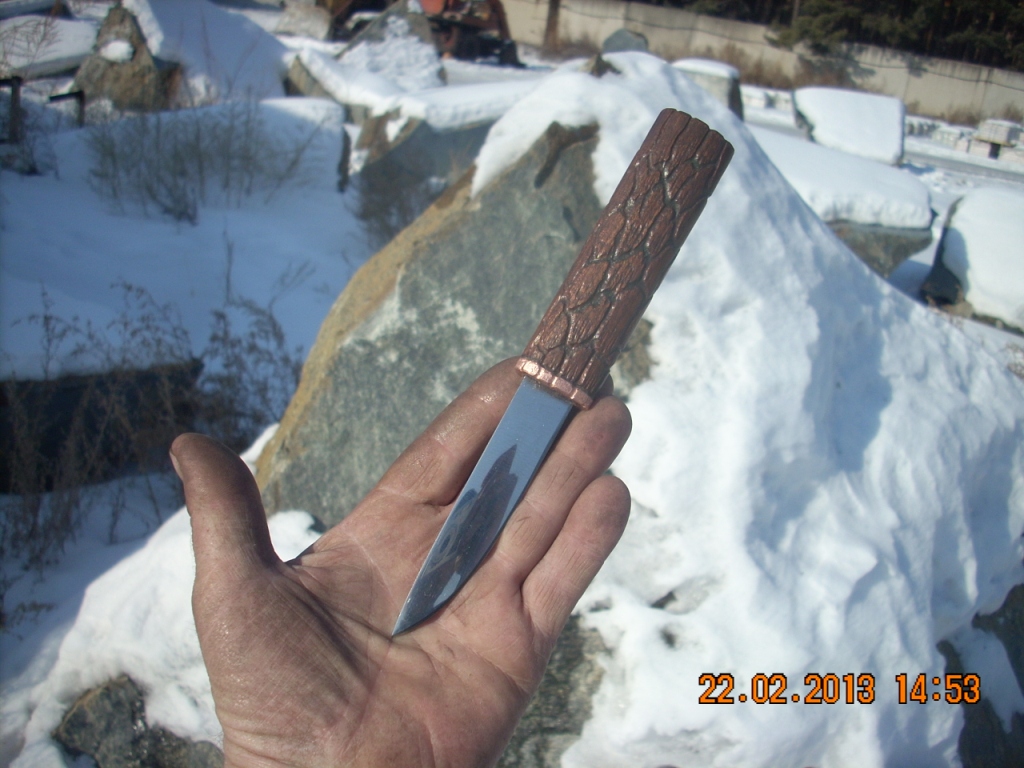 Приветствую всех! Как обещал, так и сделал ножик, по мотивам Якутский нож.Прежде чем начинать, внимательно прочитал тему "Якутский нож".Особенно внимательно прочитал про дол. О его происхождении у якутских ножей, а не для чего он нужен. Вчера с утра нашёл обойму подшипника, разрезал, нагрел в печке, распямил. Затем на черновую выточил клинок. В этой же печке закалил его, сделал отпуск где-то 1час и завершил окончательную обработку клинка. Дерево на рукоять взял махагони (прислали ребята из Израиля). Ну для больстера взял медь. Они по цвету друг другу подходят. Прав я или нет, но на некоторых якутах видел больстер. Ну вот кажется и всё об этом.